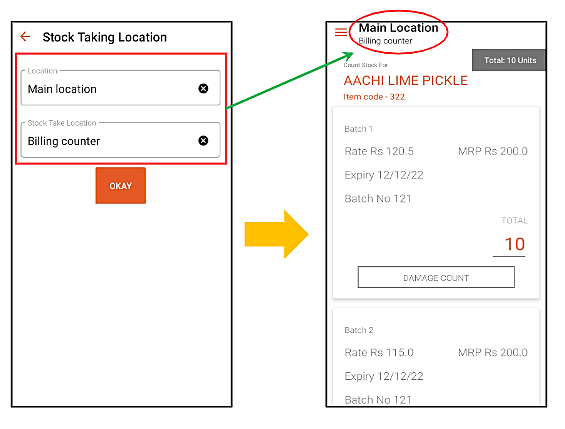 Step 7: The Stock taker will be able to do stock count in a specific location of a store. They can select the stock take location, by clicking on the Main Location and selecting from the list.