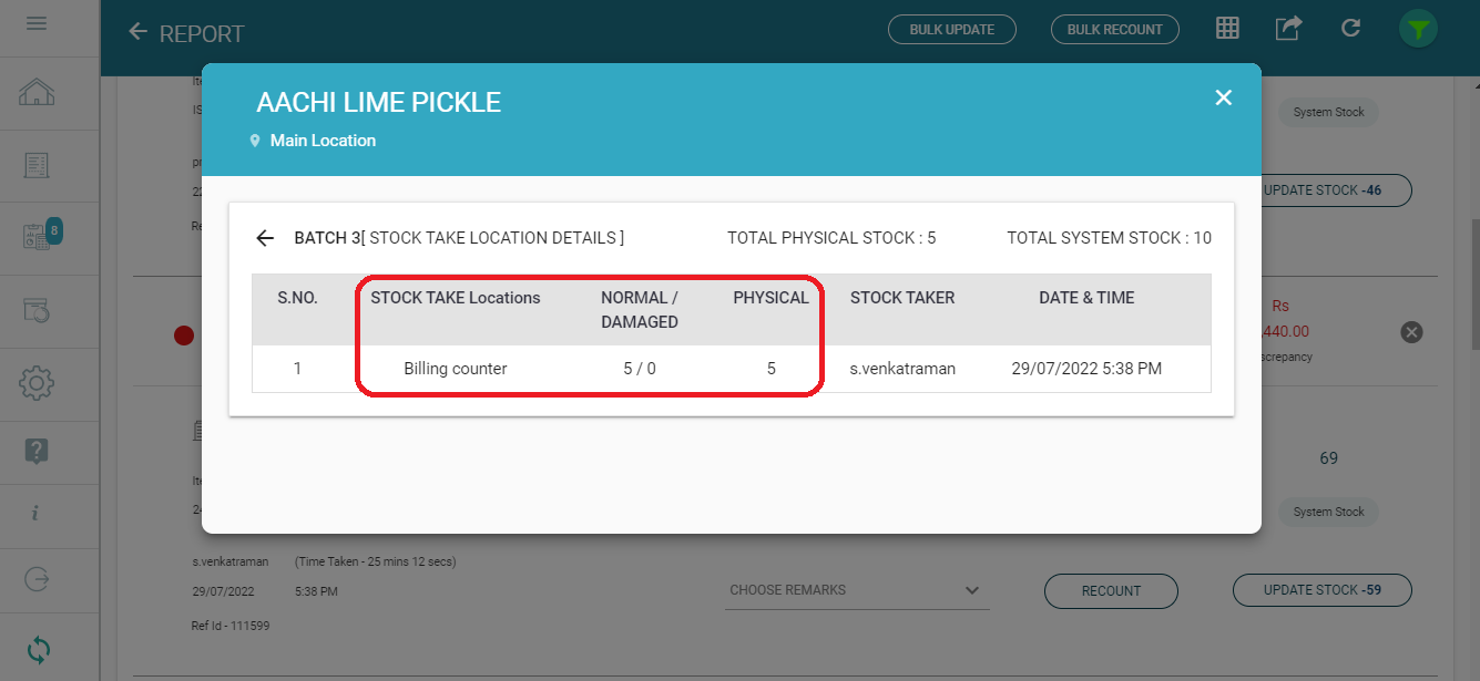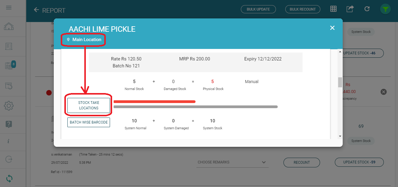 Step 9: You can understand the stock count of an item at different locations in a store by clicking on the "Stock Take Locations" button at the left of the pop-up window.