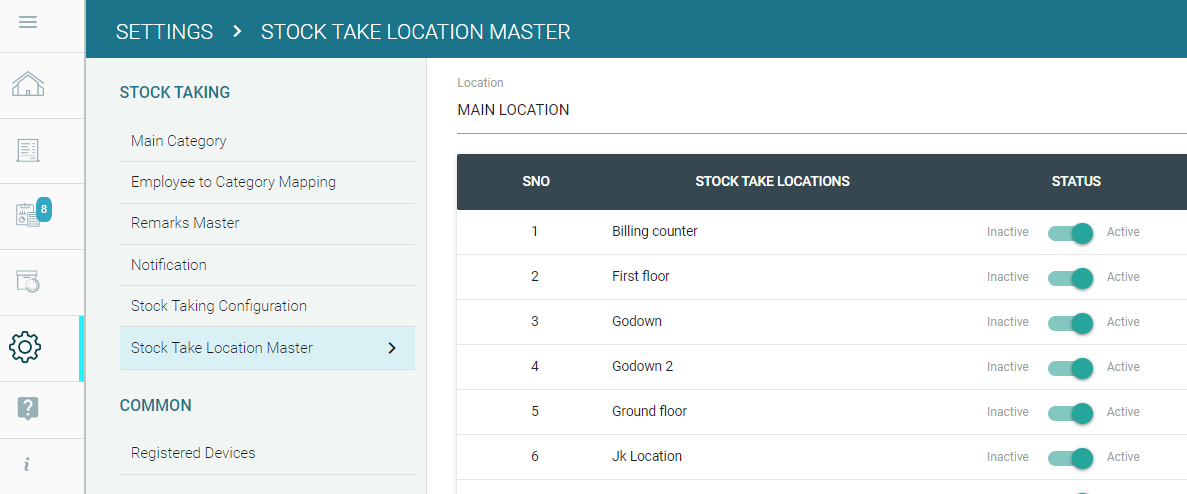 Step 4: Enter the name of the virtual locations (Example, Billing counter, First floor, Godown, Ground floor, Rack etc) in the column 'Stock Take Locations' under the 'Stock Take Location Master' menu. Make sure to keep the status as 'Active', and click on "Apply".
