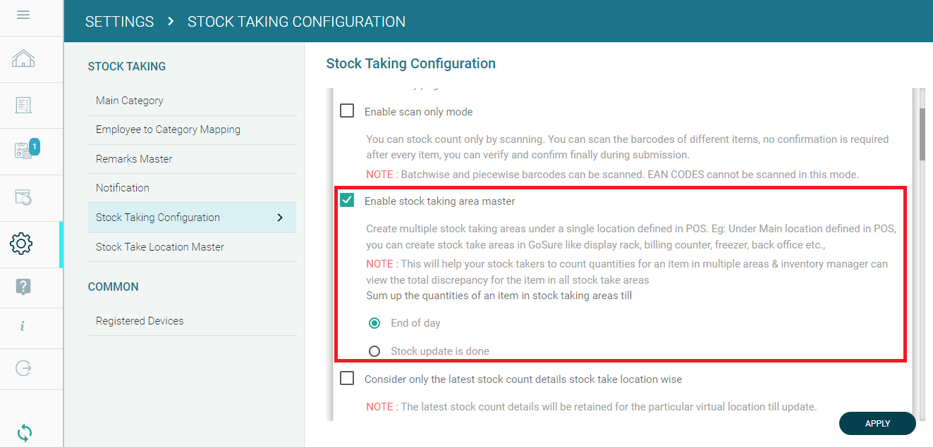 Step 2: You can decide how the summing up of stock count from different locations is to be done. If you want the quantities to be summed up only at the end of the day, enable "End of day" and if you want to be summed up and updated once an update is done by employees, enable "Stock update is done". Click on "Apply".