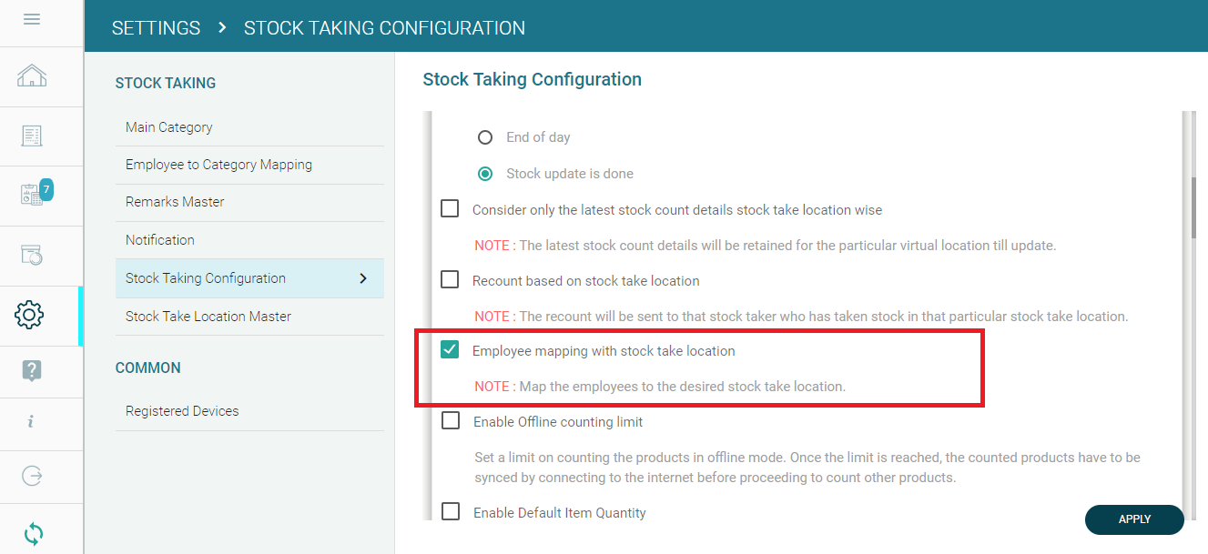 Step 5: For mapping the employees to stock take locations, enable the configuration "Employee mapping with stock take locations" from the 'Settings' tab.
