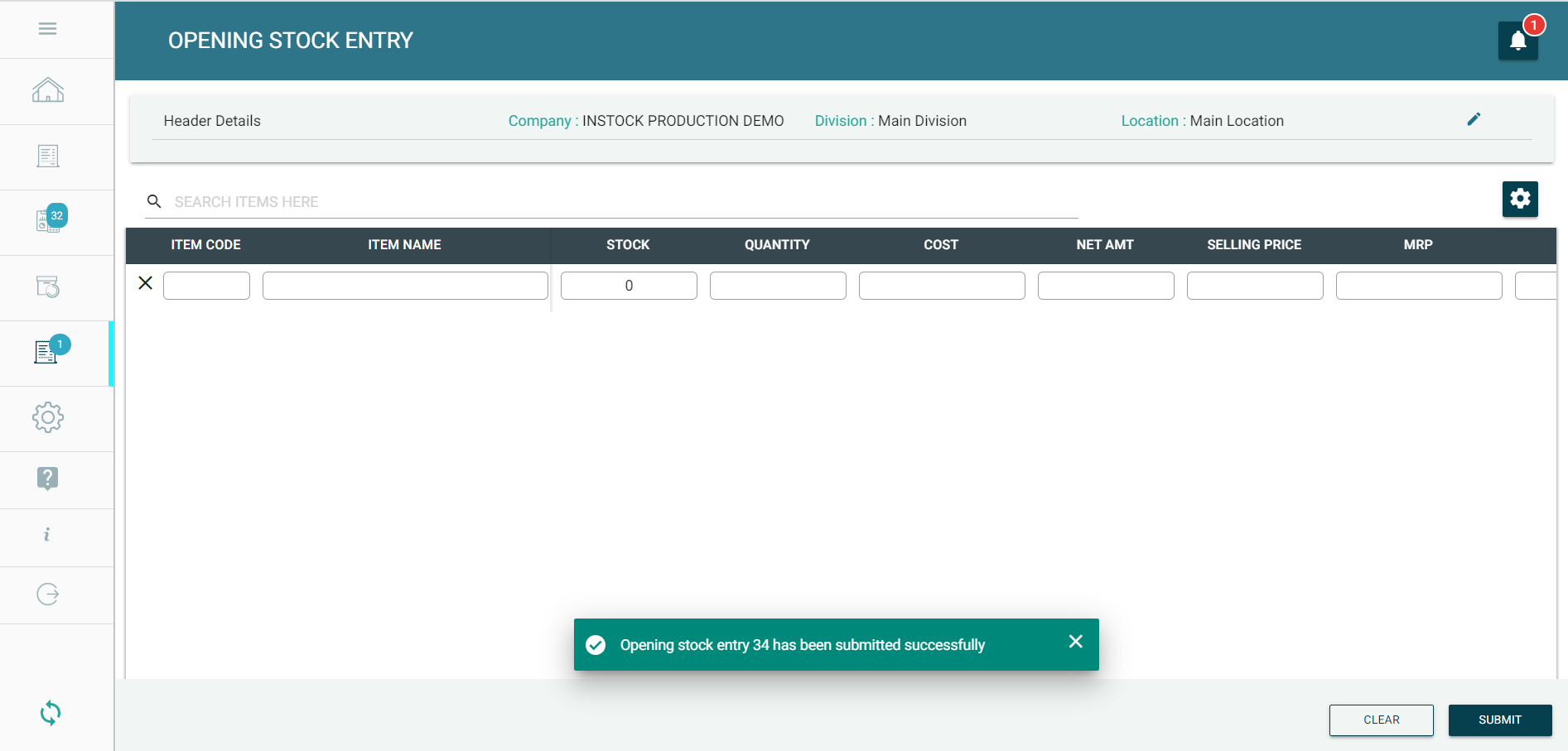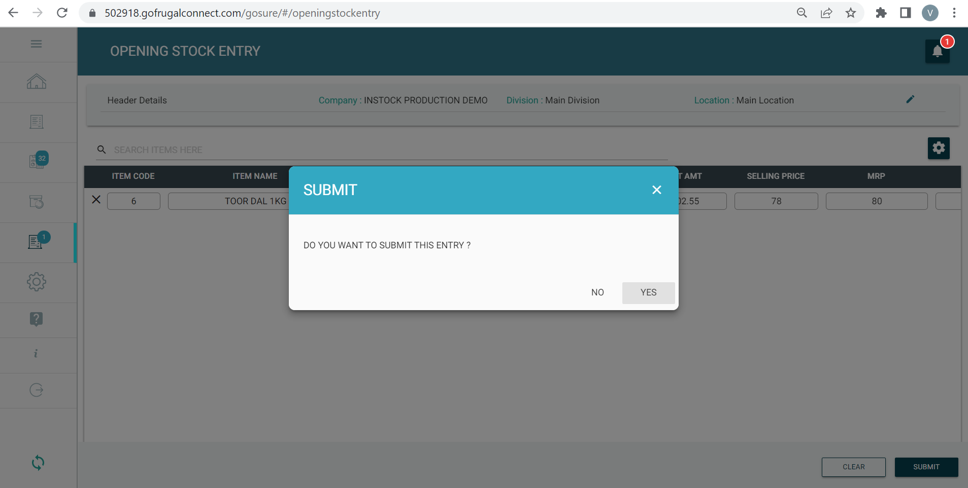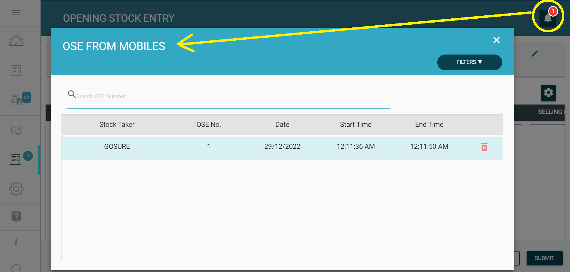 Step 7: You can load the OSE made in mobile app, in the GoSure StockTake web-app, by clicking on the Bell or notification icon