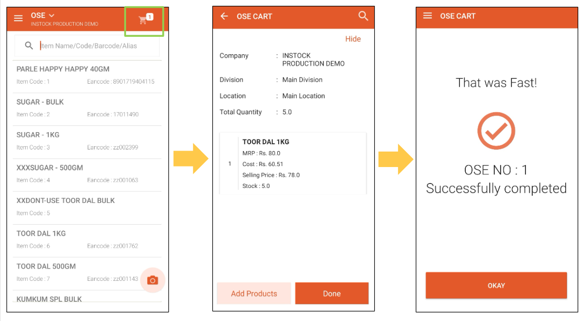 Step 5: Click on the OSE Cart icon to see the list of items added to the cart. You can continue to add items by clicking on 'Add Products' button, and once all the items are added, click on 'Done'.