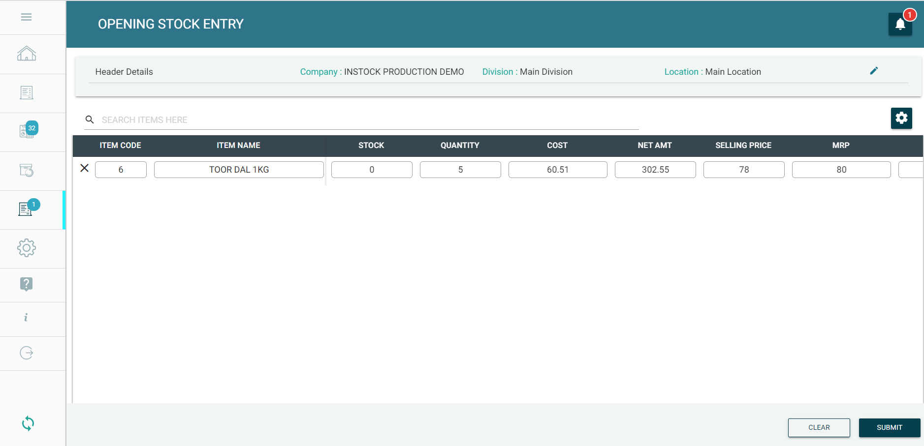 Step 10: You will find the Opening Stock Entry to be submitted, and the OSE No. is generated successfully.