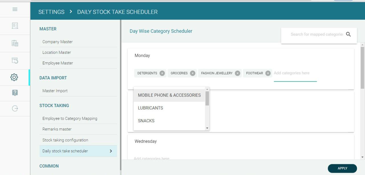 - Now the employees (stock takers) who are mapped with categories will be sent stock counting tasks based on the categories mapped for the corresponding day on a regular basis.