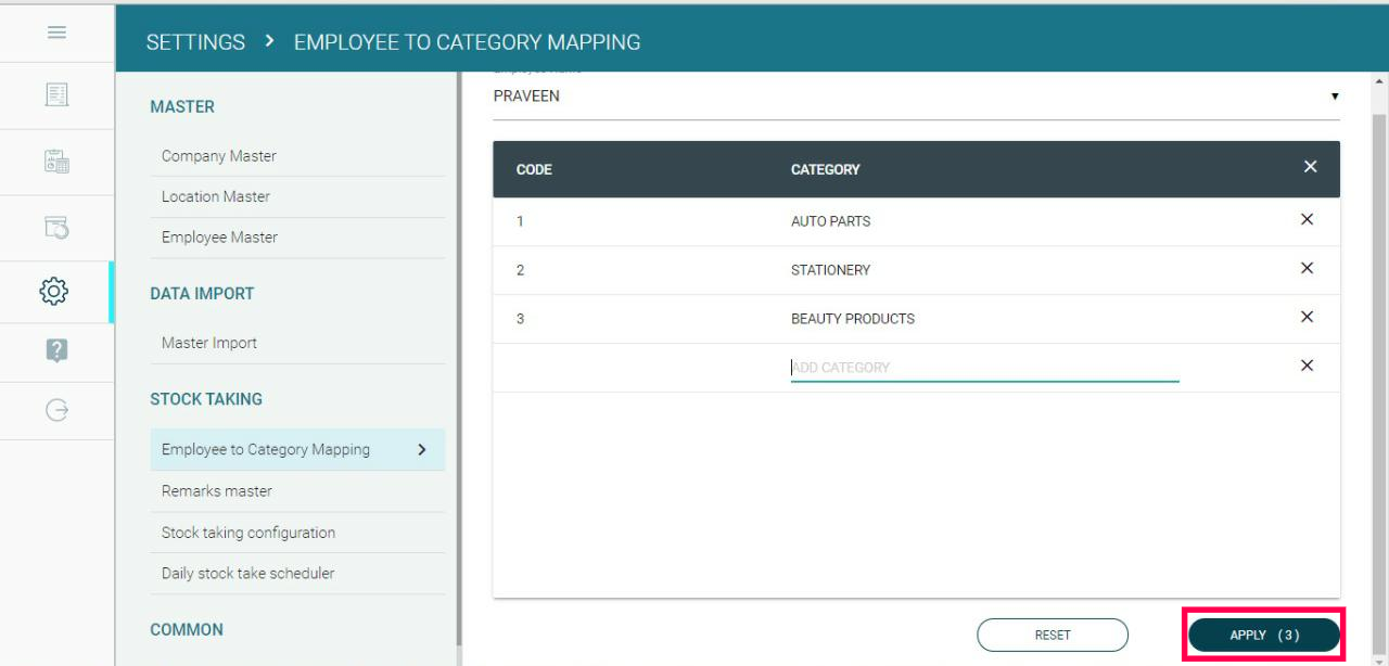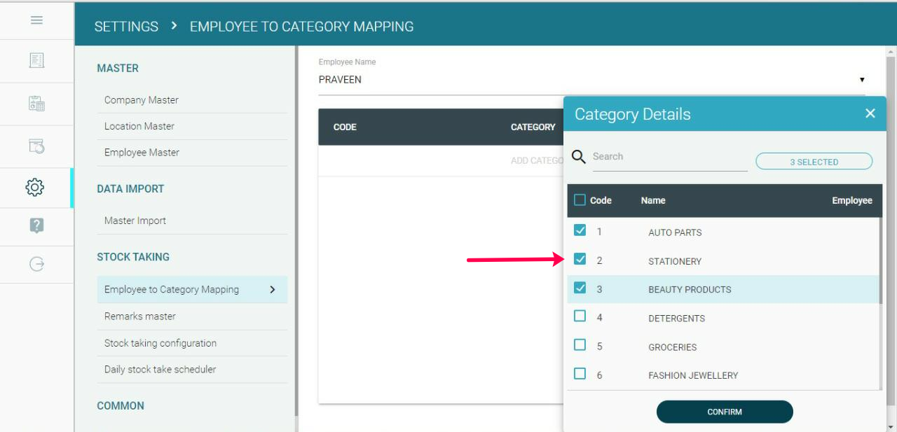 - Select the employee and you can select the categories to be mapped under the stock taker.