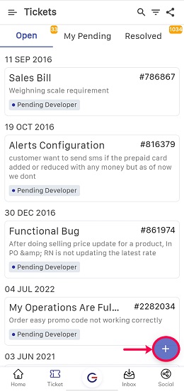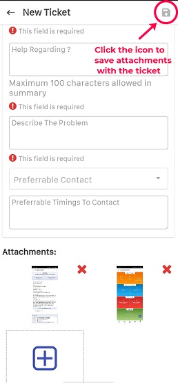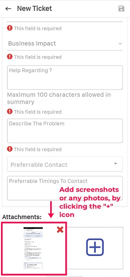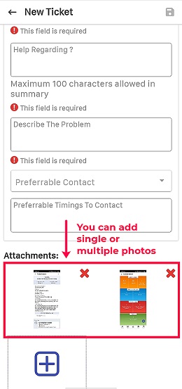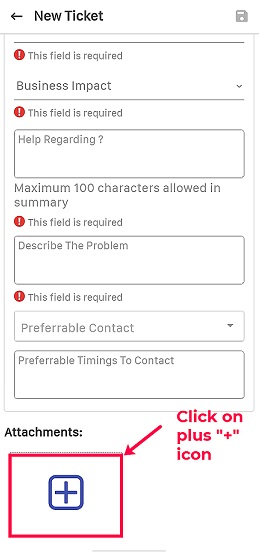 Step 3: To add photos or any attachments to a ticket, Click on the “+” icon at the bottom of the screen.