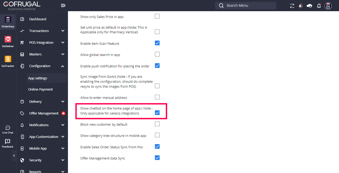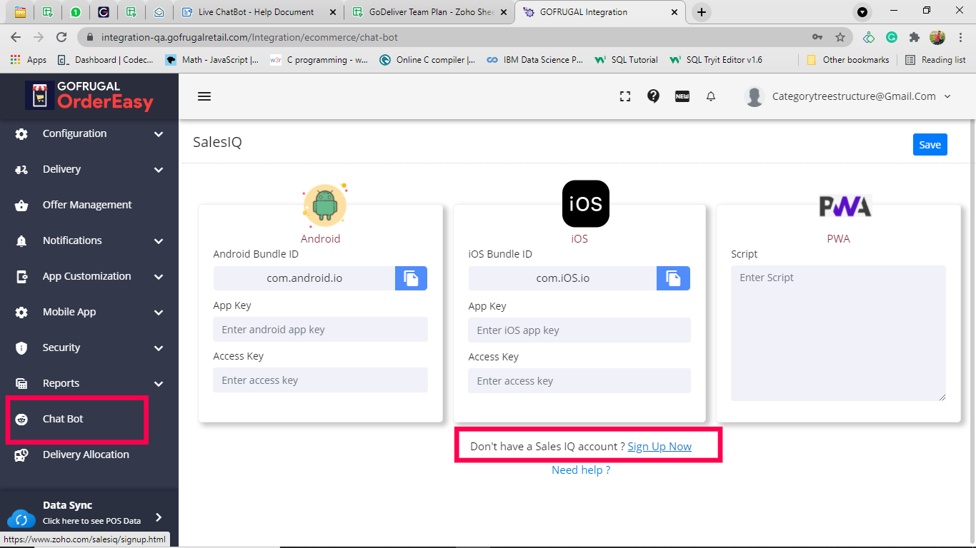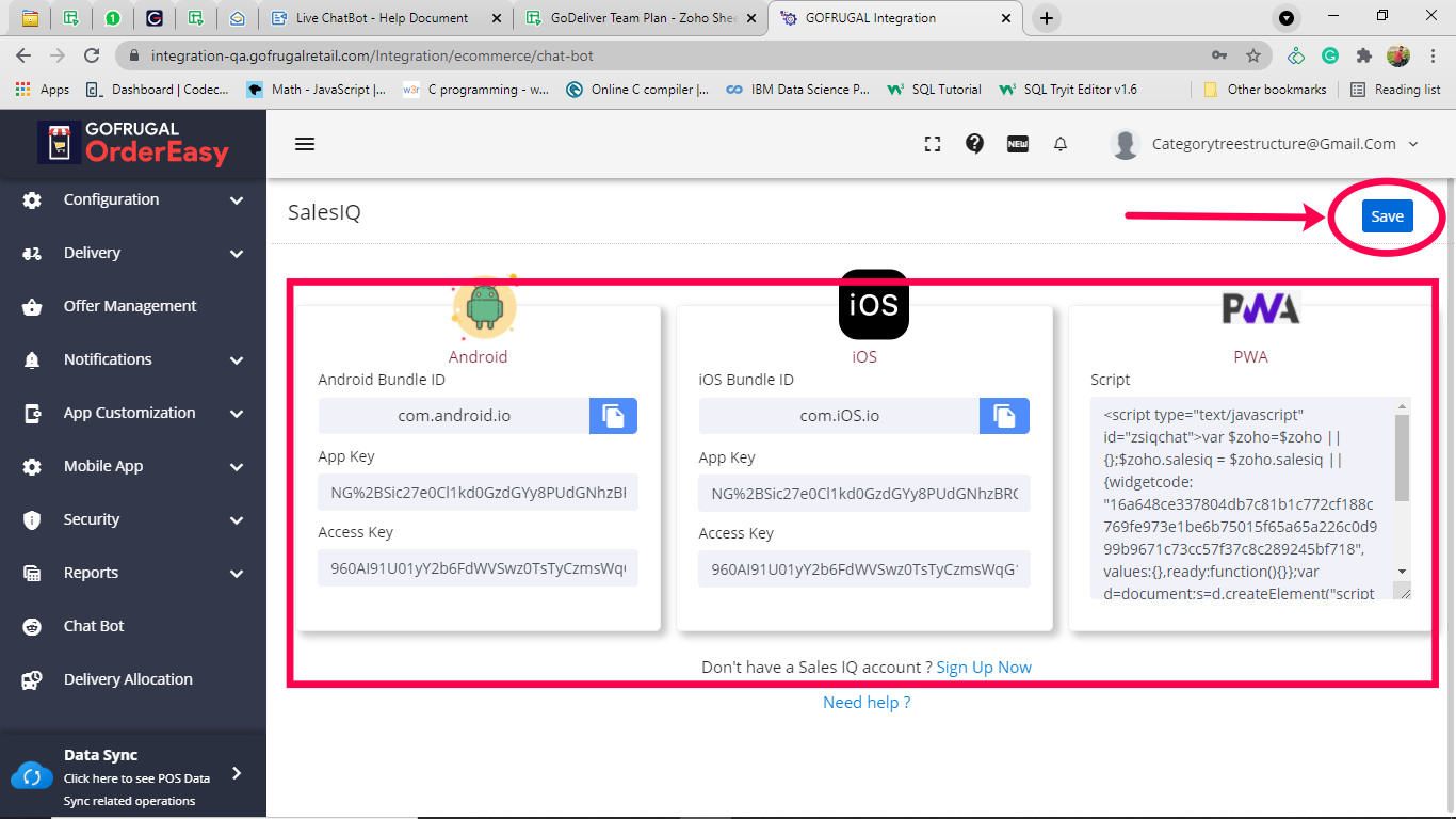 To enable the Sales IQ Live chatbot please contact ordereasy-support@gofrugal.com . Once you have enabled the Sales IQ Live chatbot, follow the steps to configure the "Live" Chat Bot integration.