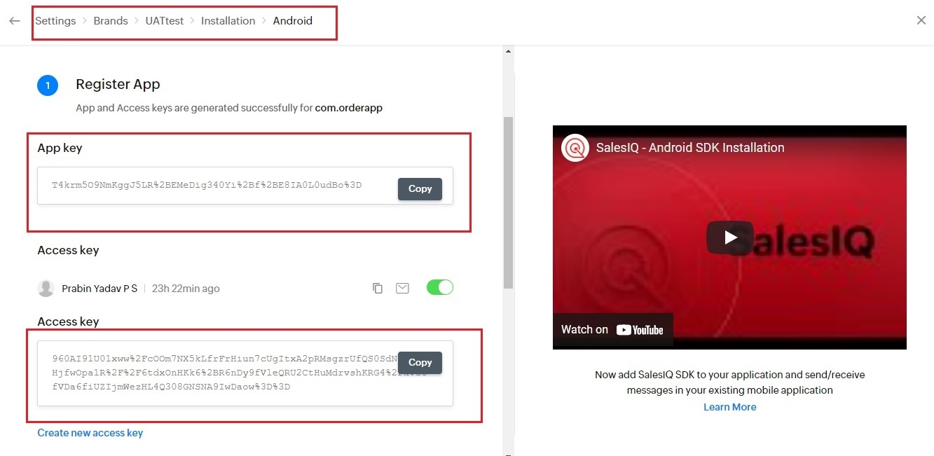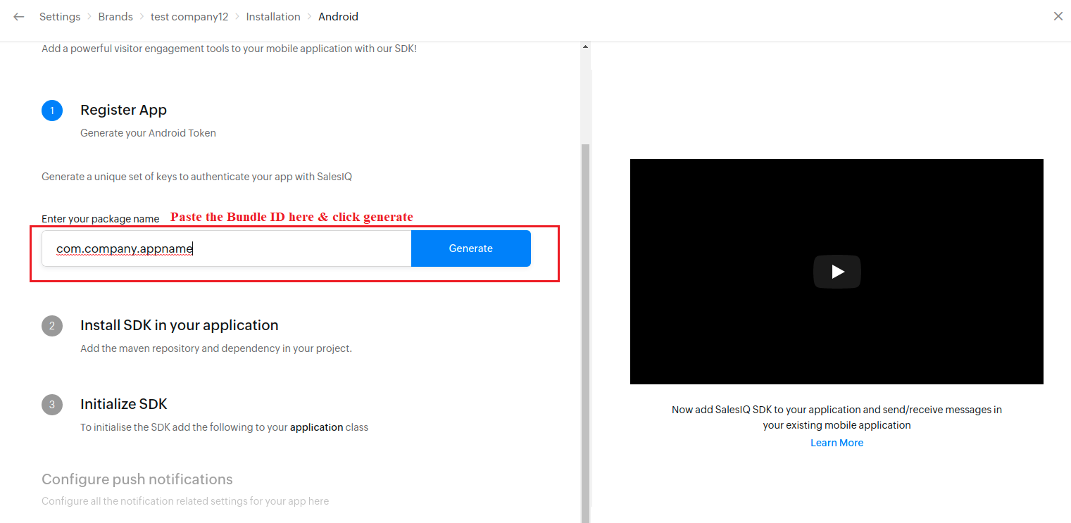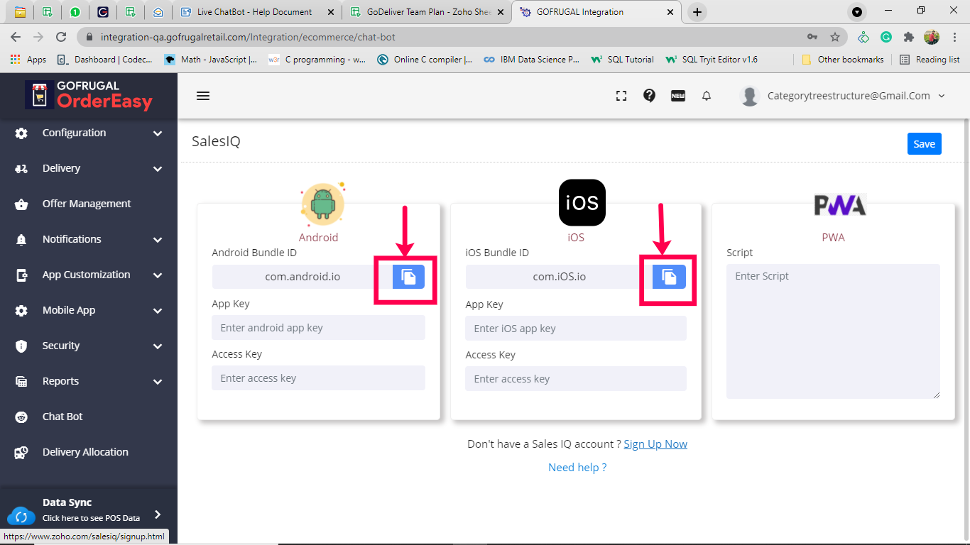 Once the salesiq account is created, you need to configure the respective platforms (Android/iOS/PWA) in the integration portal. To get the API key & Access key, copy the Bundle ID for the respective platform as shown in the below image.