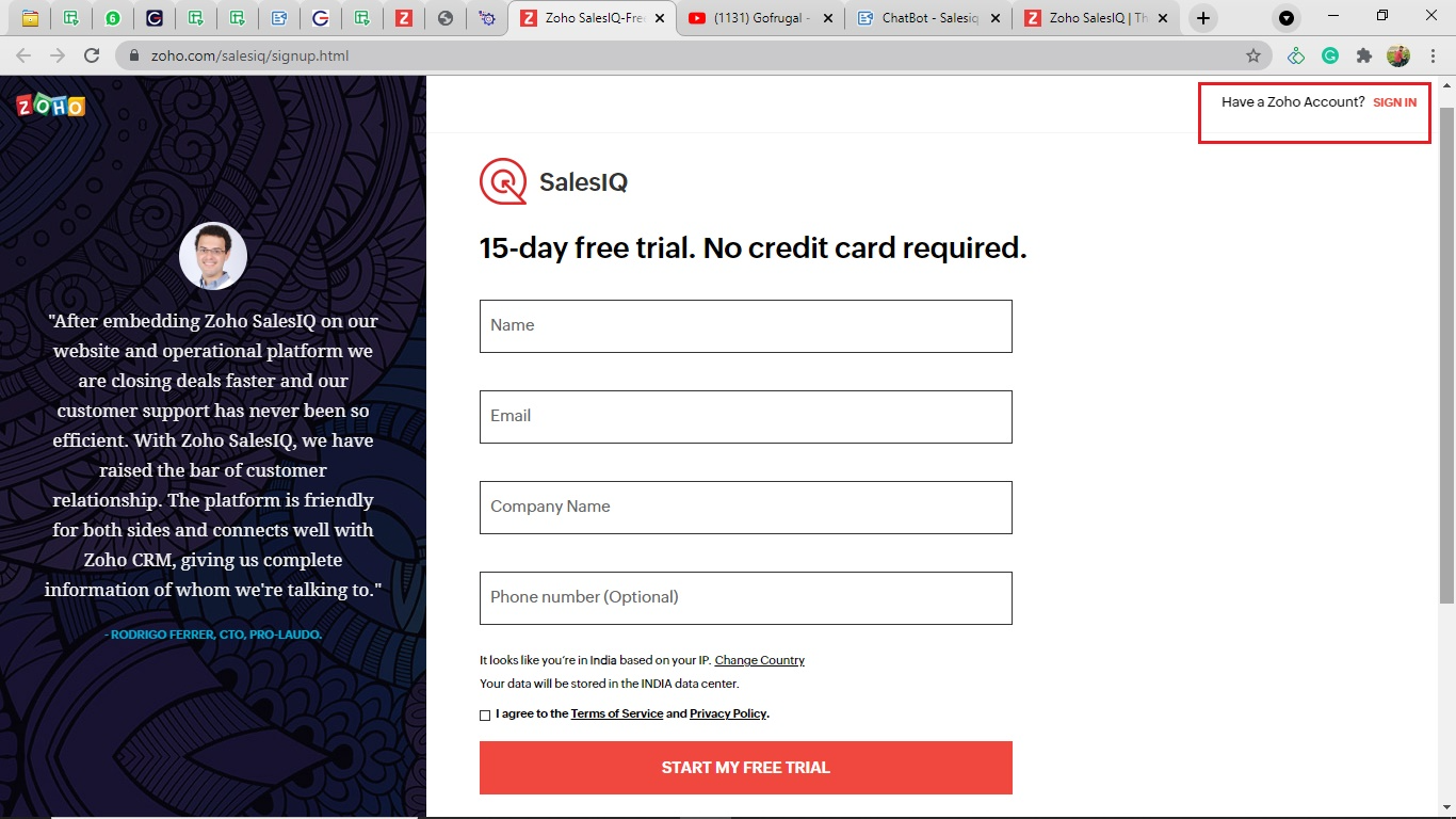 Once you click on the signup option, you need to create a free Zoho account & sign in as shown below. ( Note: The following account will be a free trial )