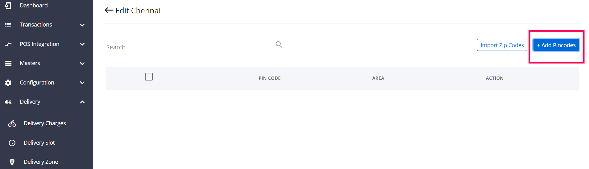 Step 11: In case of more than one pincode, the option to import zip codes can be found under created zones