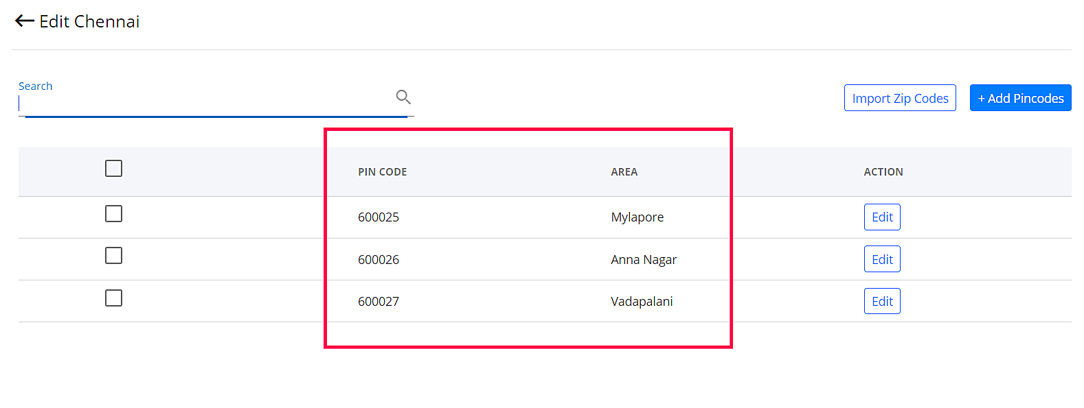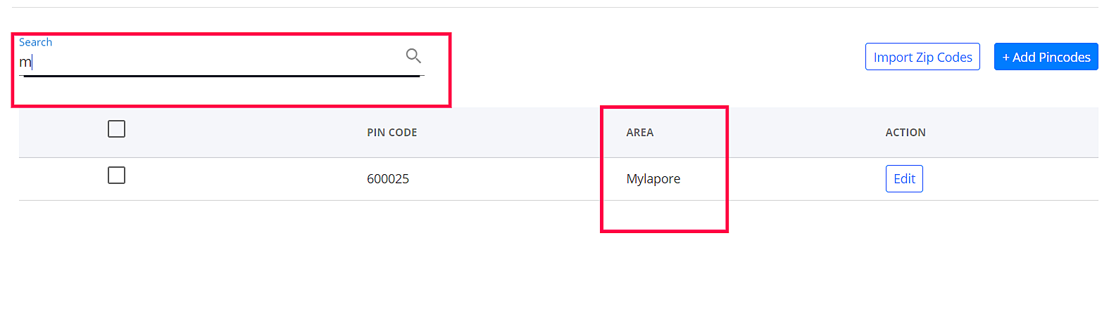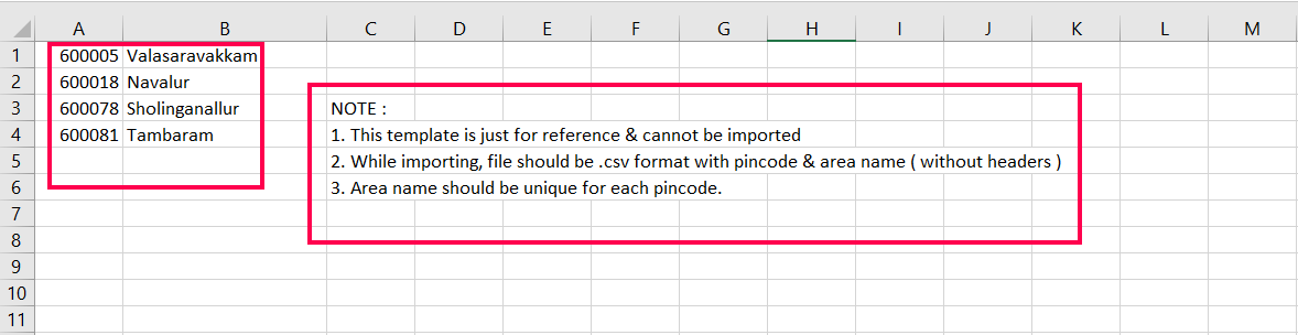 Step 13: Ensure the pin codes and area names are unique. These entries will not be accepted if they are duplicates.