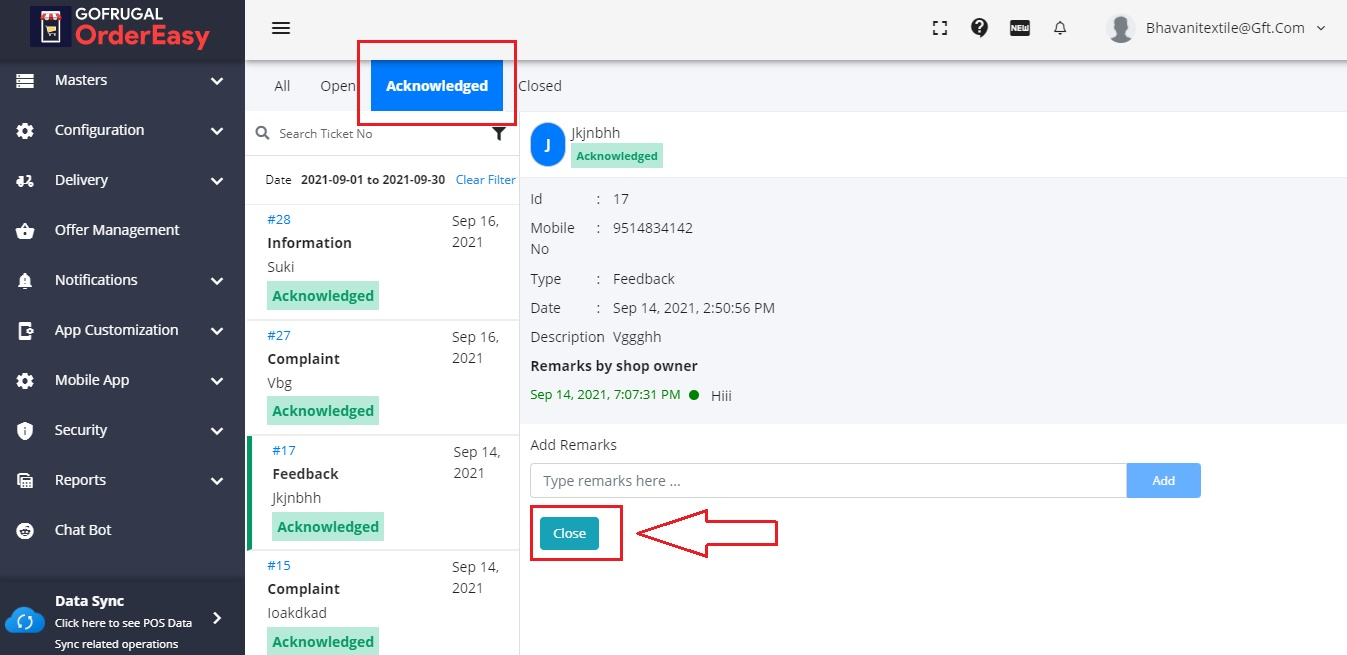 Once the tickets are acknowledged, customers will be able to get the push notifications in your branded app & you can check the acknowledged tickets on the "Acknowledged" tab. Also, the tickets can be closed in this tab if a customer query is solved.
