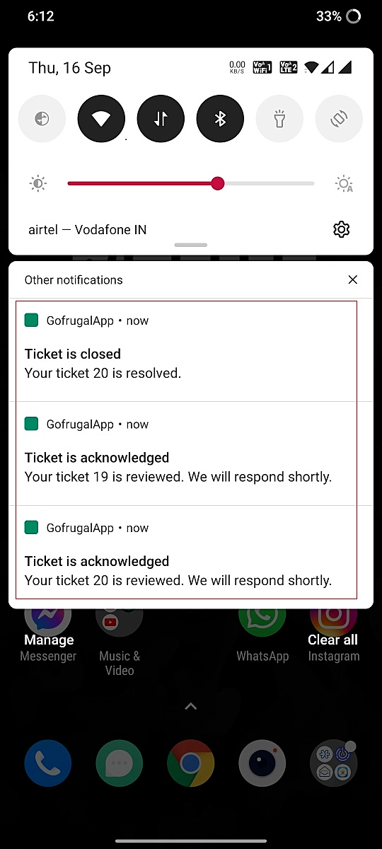 The end-user can use the " Reach Us " option in your branded app and the status will be shared as push notifications as shown in the below images.