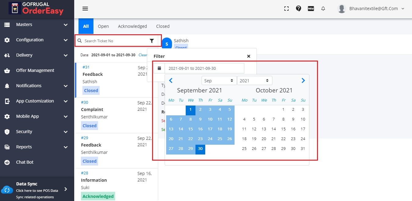 Note : We can use the filter option under every tab to search by Ticket No. Also, a date filter can be applied.