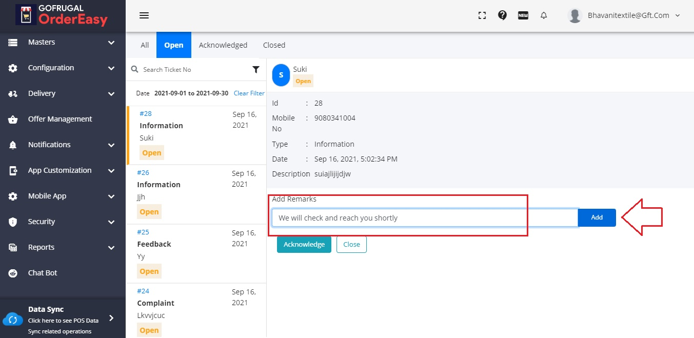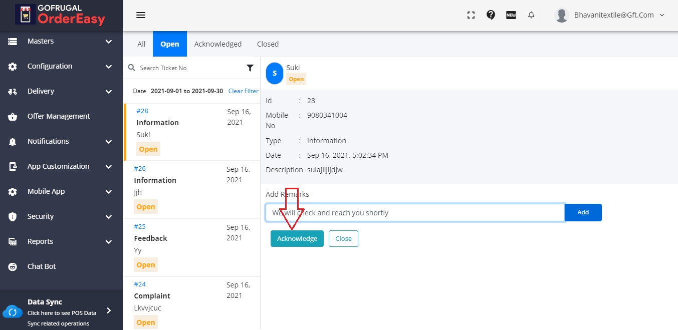 You can see all the open tickets which are yet to be acknowledged by clicking on the "Open " tab. You can acknowledge directly or add remarks as shown below.