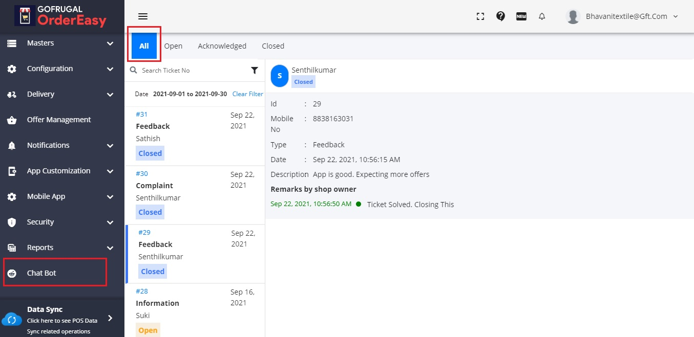 Go to the ChatBot option. Here you will be able to see all the tickets raised by the customers by clicking on the " All " tab.