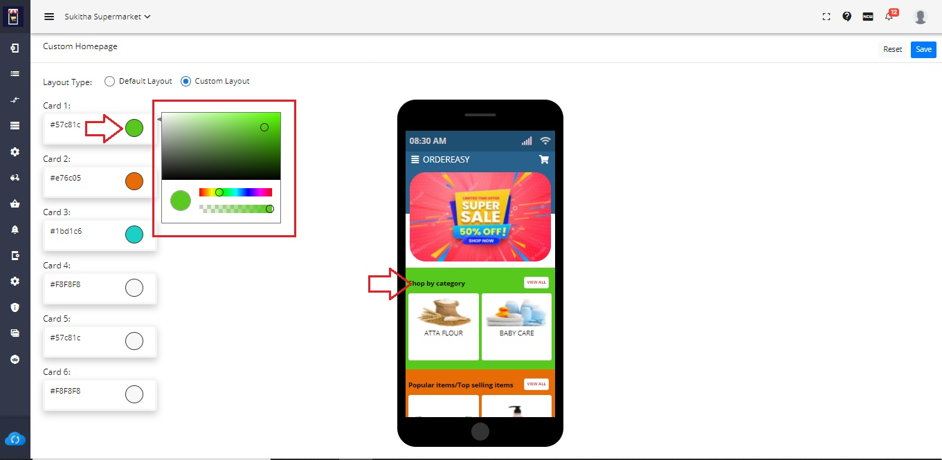 Click on the color circle on the respective card and use the mouse pointer to select the required color for the background. The preview will be shown in the portal as shown below :