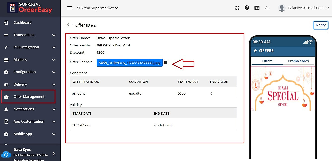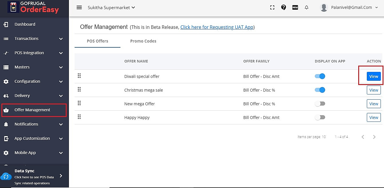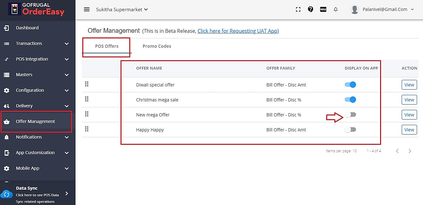 NOTE: You can use the " display on app" option to show/hide the offers in the app. Also, you can drag and arrange the list of offers based on this order, offers will be displayed in your app.