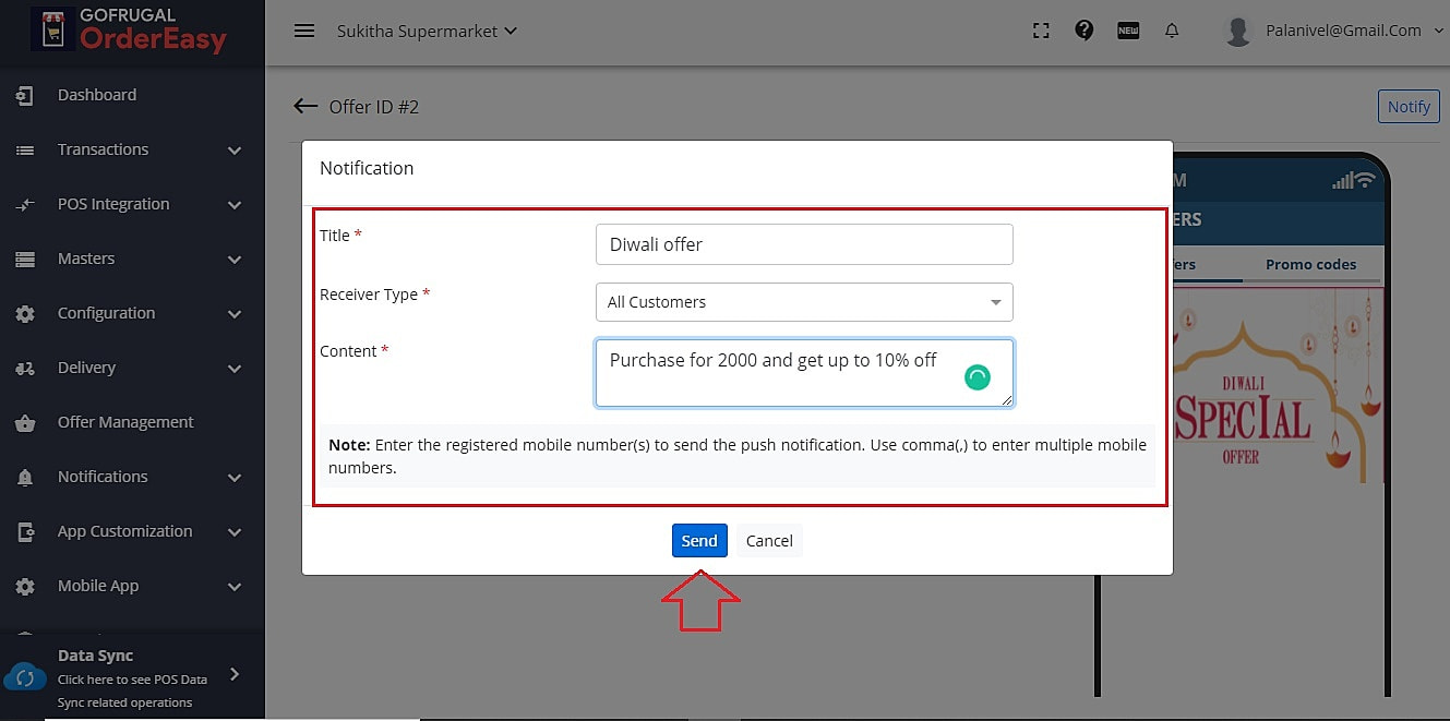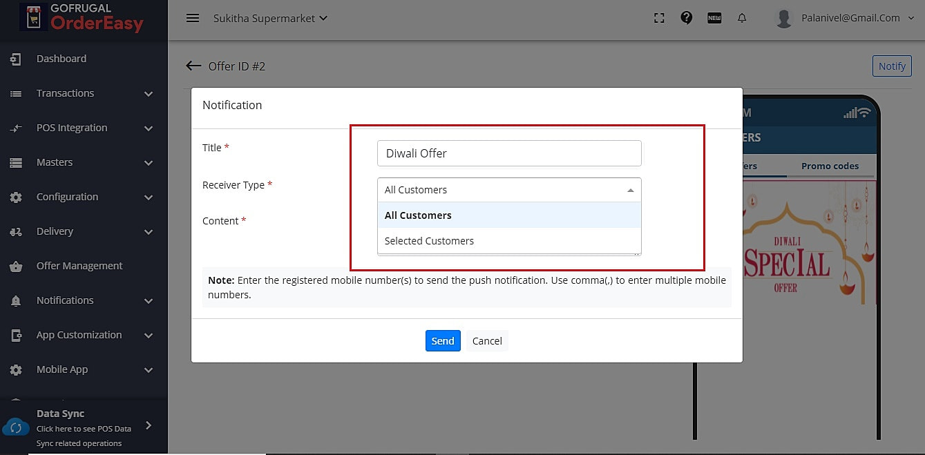 In the view screen, you can even send push notifications to your customer's app by using the "Notify" option. By clicking the notify option you can set a title and description and send the same to either all customers or specific customers by entering their mobile numbers as shown below in the images.