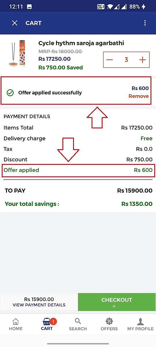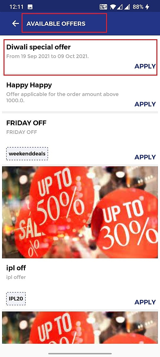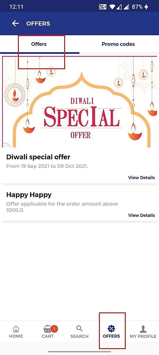 Once the offers are set up in the portal your customers can view the offers in the " offers" tab in your branded mobile app and the same can be availed in the cart screen.