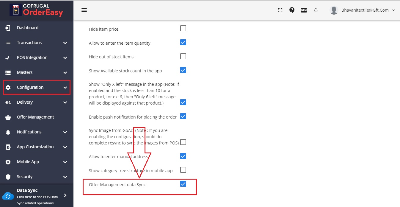 Once the offers are created in base products, Login to integration.gofrugal.com with admin credentials. Go to Configuration --> App Settings and enable " Offer Management data sync ".