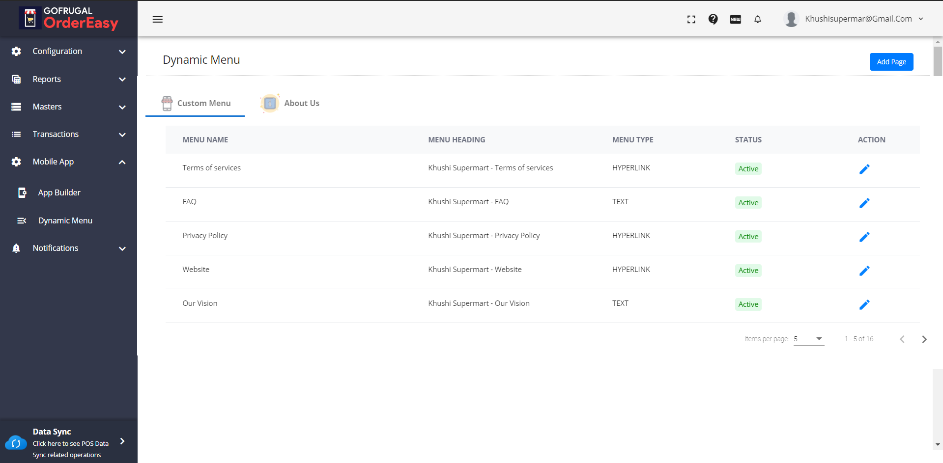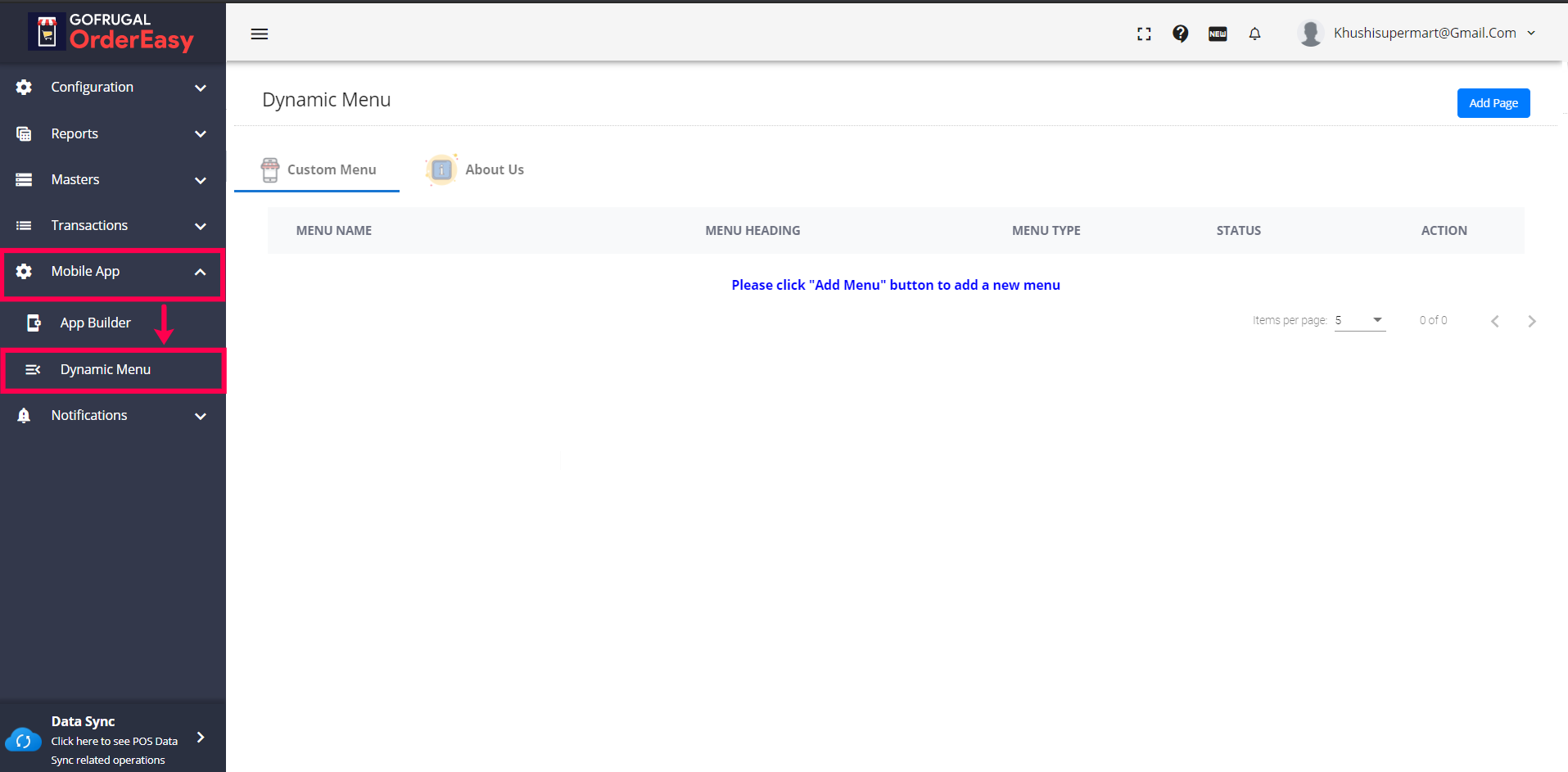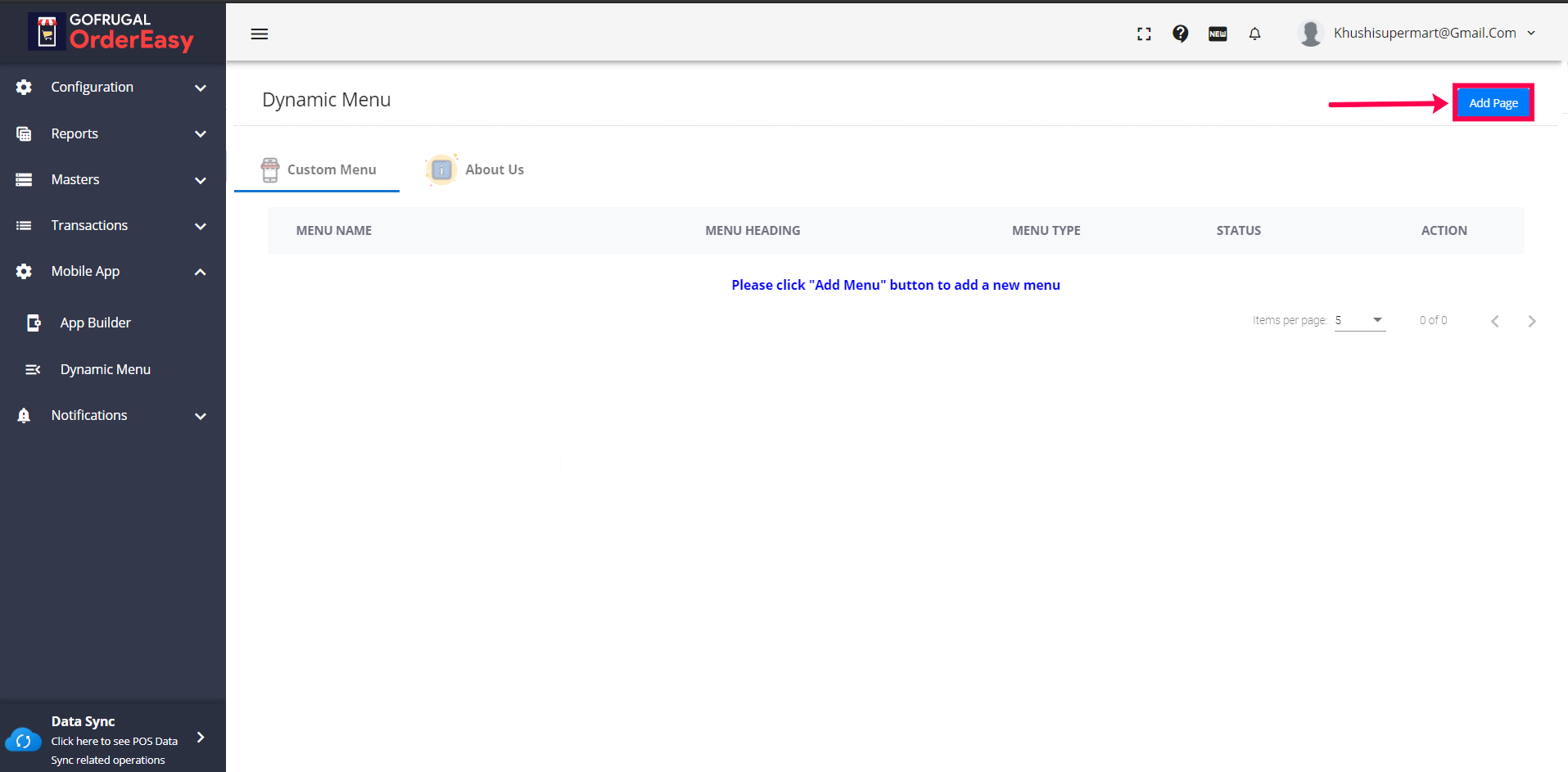 1) To create a new menu, click on the 'Add Page' button on the upper left corner of your screen.