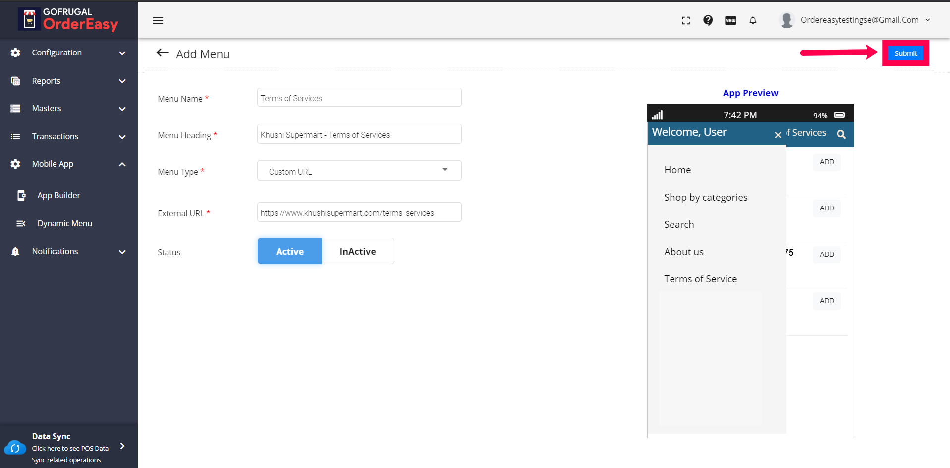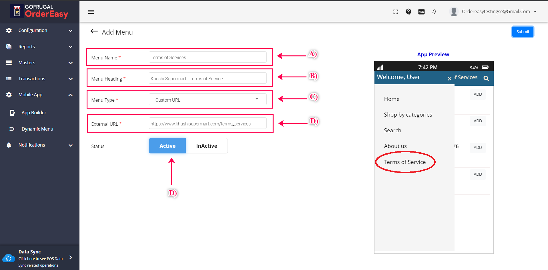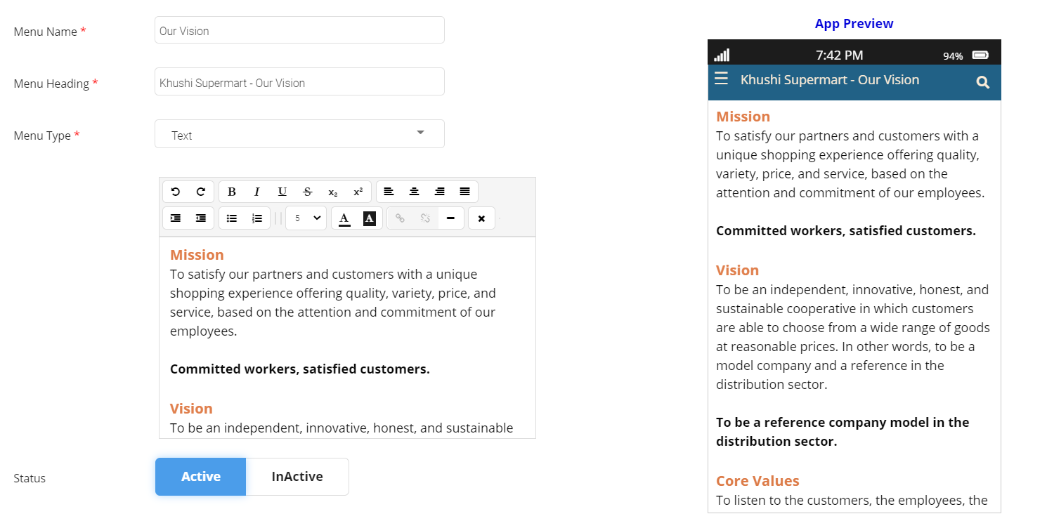 D) Active/Inactive: You can use the toggle option to show or hide the created menu in the app.