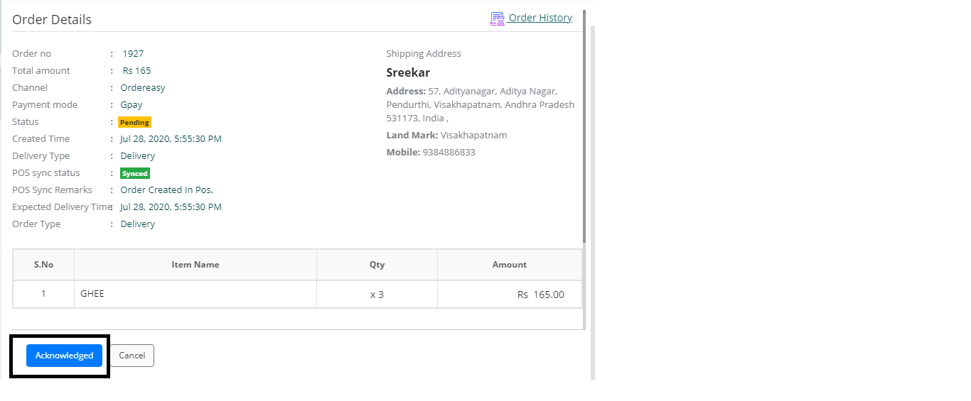 2. Select an Order. Click on "Acknowledged" to accept the order. Once the order is acknowledged, it will move to "Acknowledged" filter.
