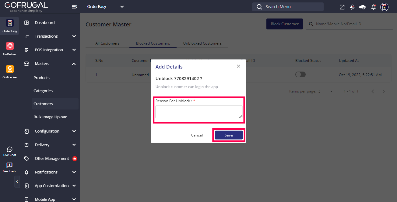'Add details' Popup screen will open. A reason for unblocking a customer should be provided for your reference. Finally click 'Save'. Now the unblocked customer will be able to access your OrderEasy application with their credentials.