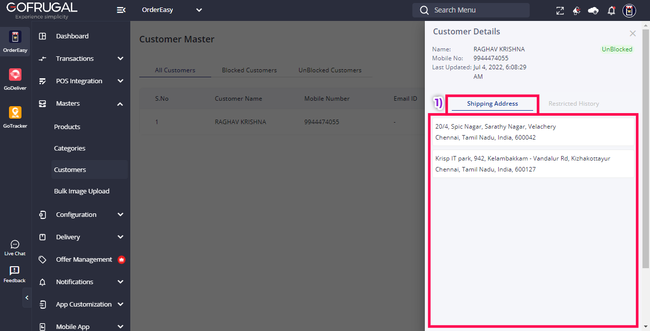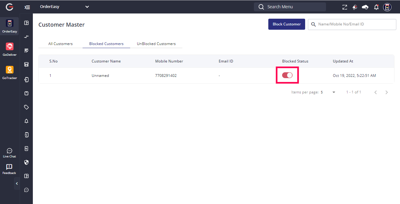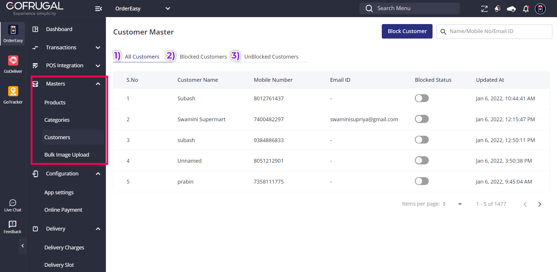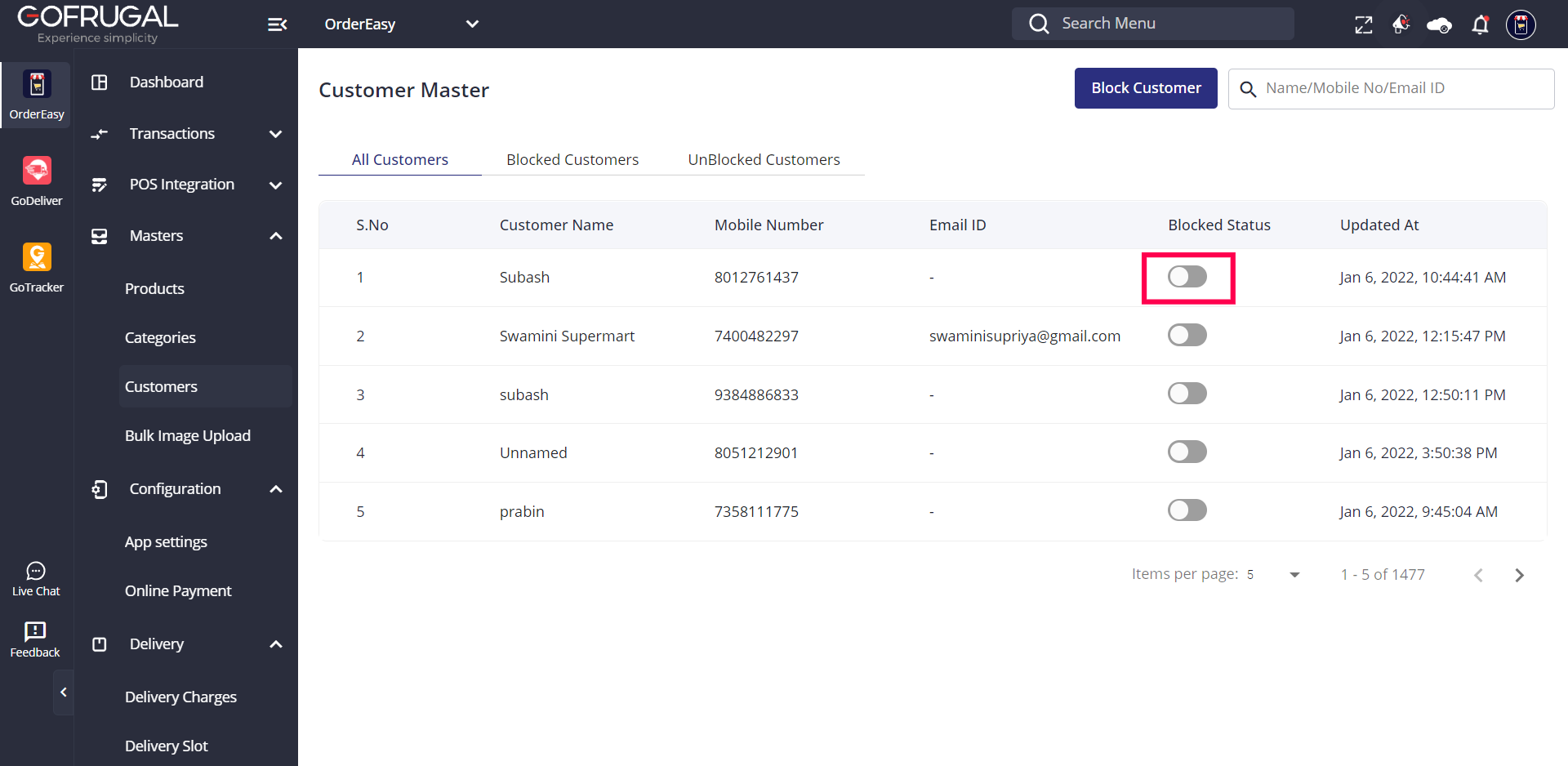 Follow these steps to block/Unblock a customer who has already using your OrderEasy application.