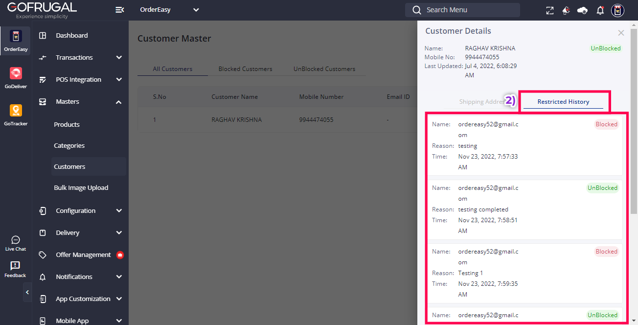 2) Restricted History - You will be able to see the history of restriction with details like which user id authorized the Block/Unblock of a customer, the reason for Block/Unblock and when the customer got Blocked/Unblocked.