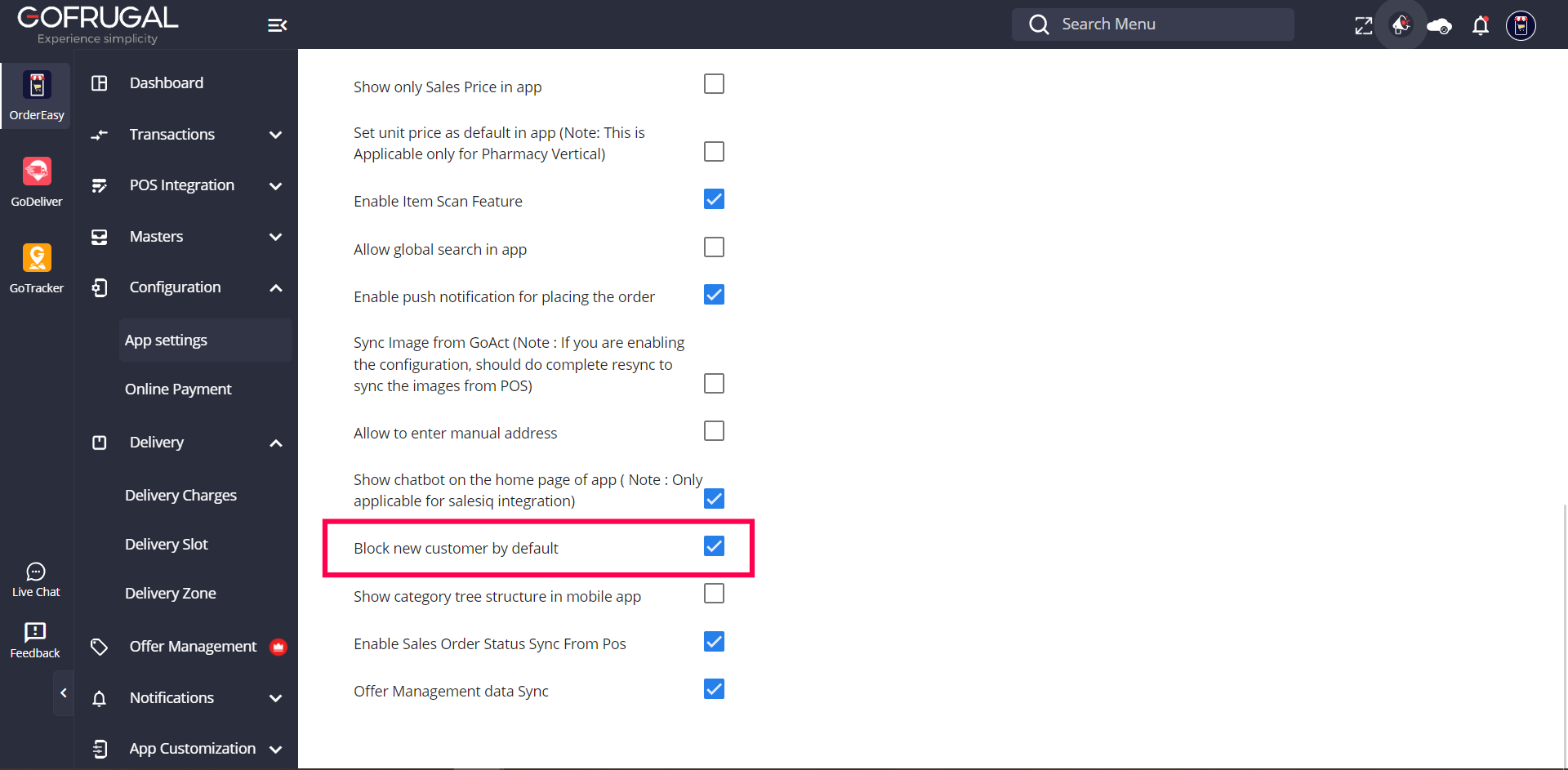 To restrict the user access to every new entry in your OrderEasy application, Select the checkbox next "Block new customer by default" configuration.