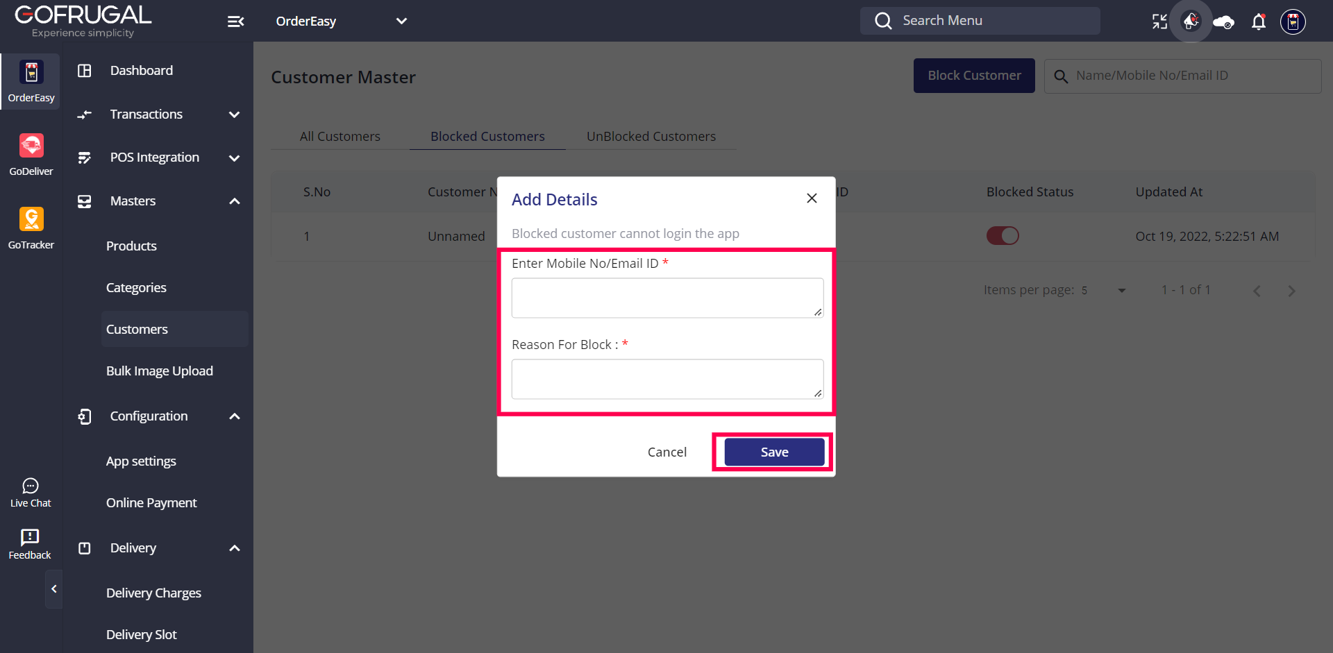 You can also restrict access to existing customers using their Mobile number/Email address. Select 'Block Customer', Add details popup screen will open. Provide the login credentials (Email ID/ Mobile number) and Reason for block.Finally click 'Save'. Now the customer with that login credential will be restricted access to your OrderEasy application.