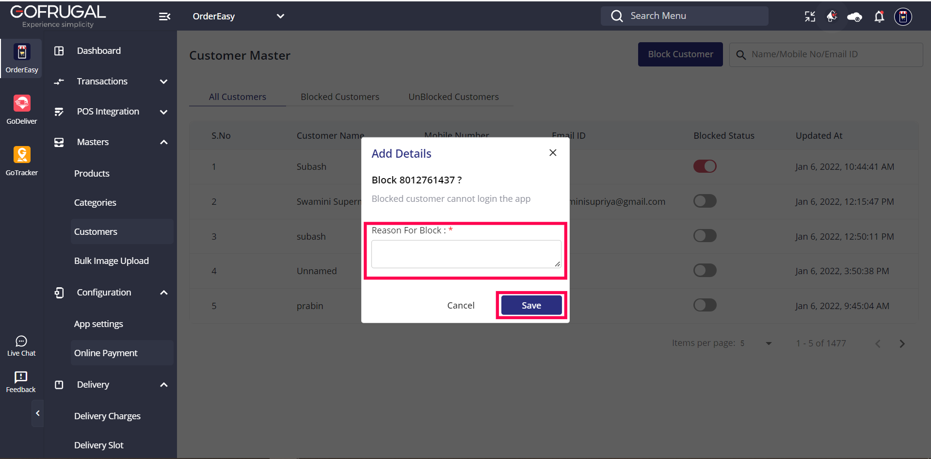 Now, 'Add details' popup screen will open. In 'Reason for block', provide the reason for restricting access to the customer and click 'Save'. Now the customer's user access will be restricted to your OrderEasy application. The customer will no longer can access your OrderEasy application using the same credentials.