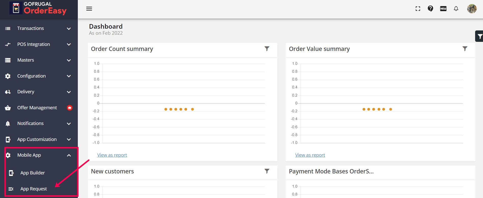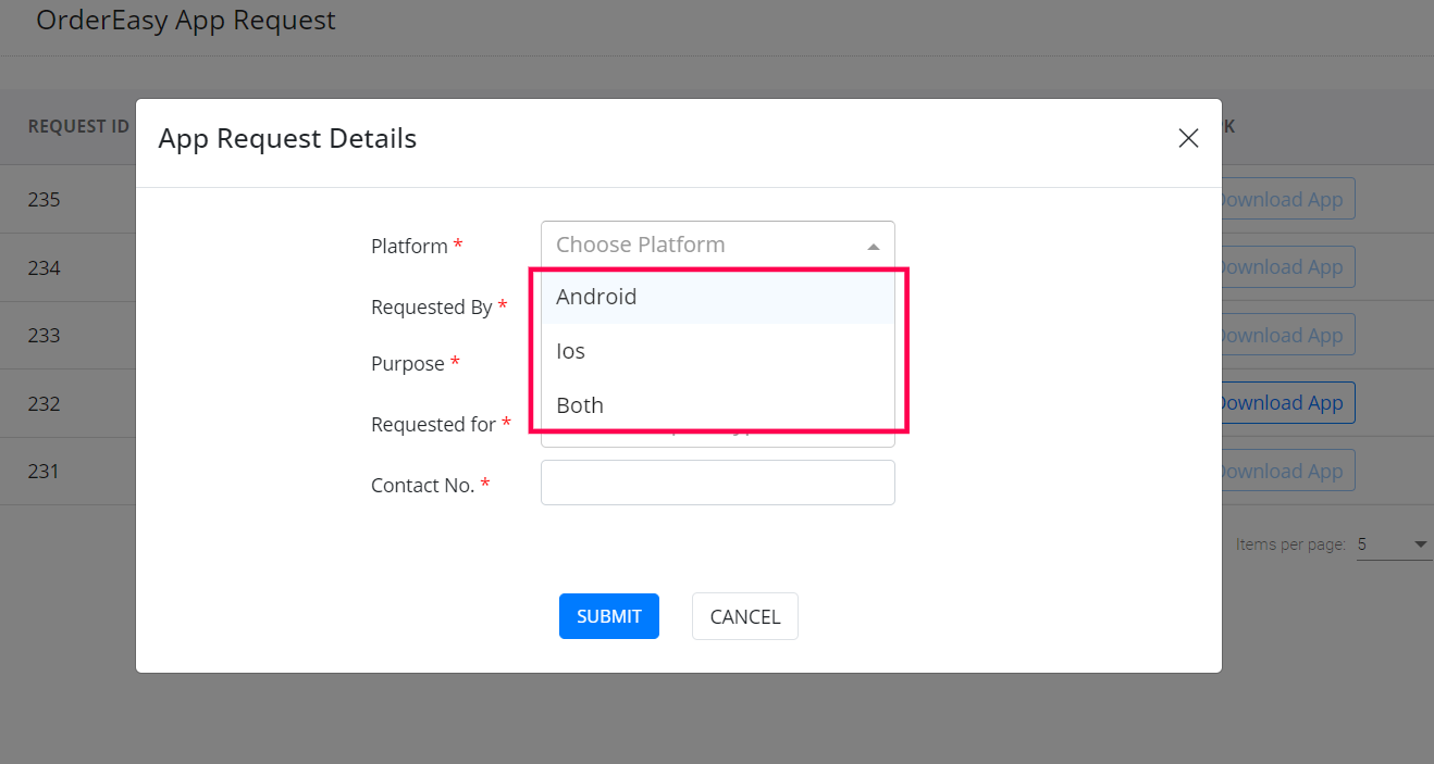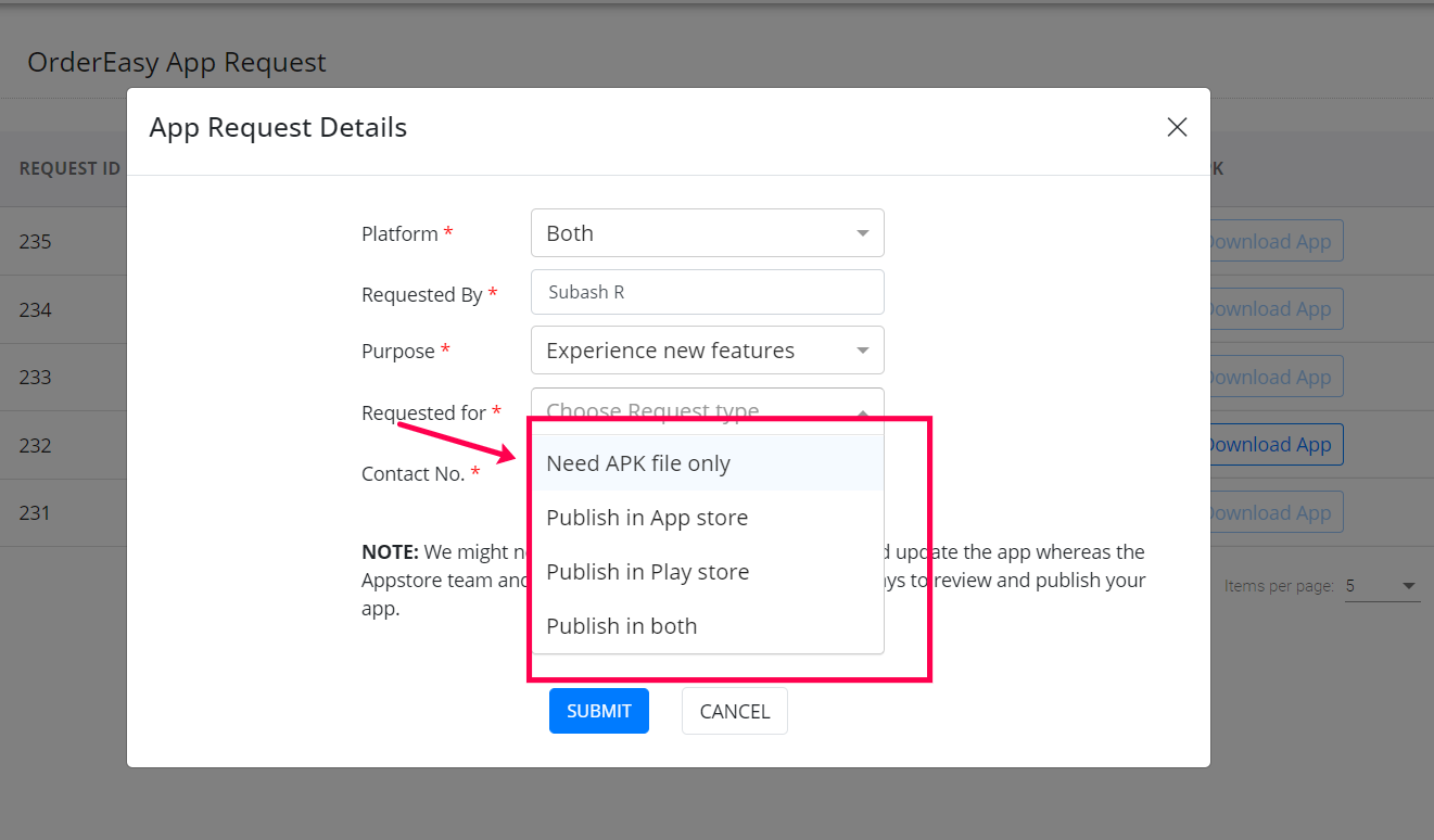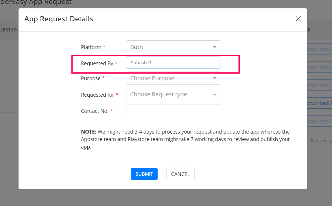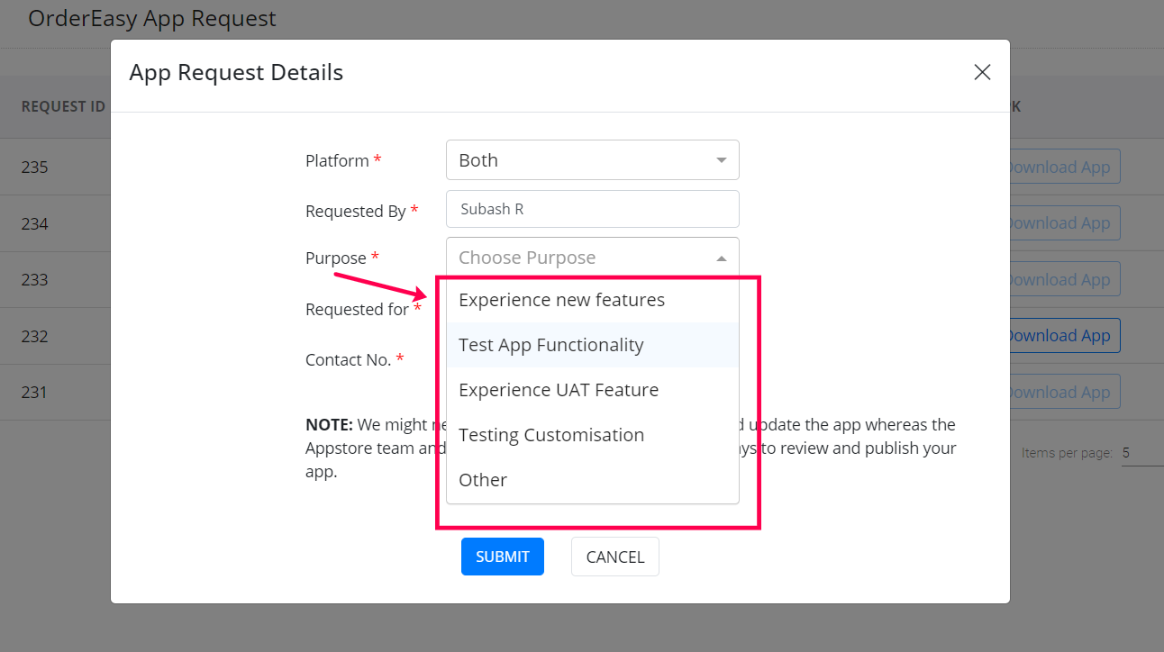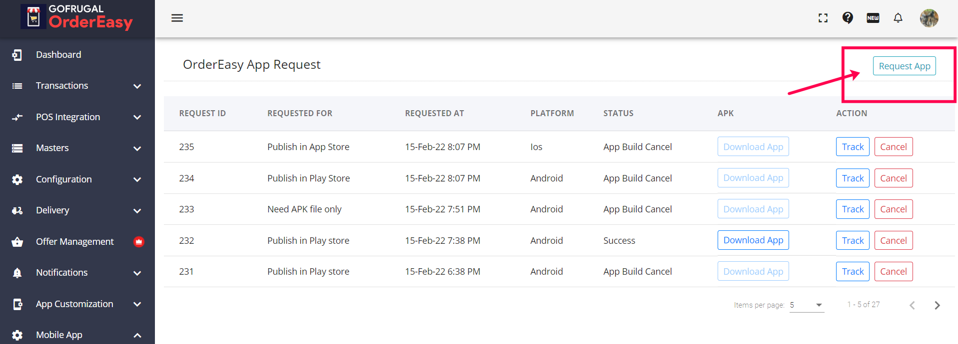 The app request option in the OrderEasy Integration portal lets you request an app update/upload without leaving the OrderEasy Integration portal or having to contact the GoFrugal team. Also, you can track the status of your updates directly within the integration portal. Raise app requests from the Integration portal and save time and effort.