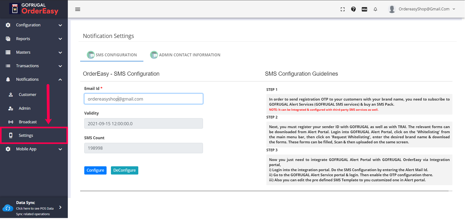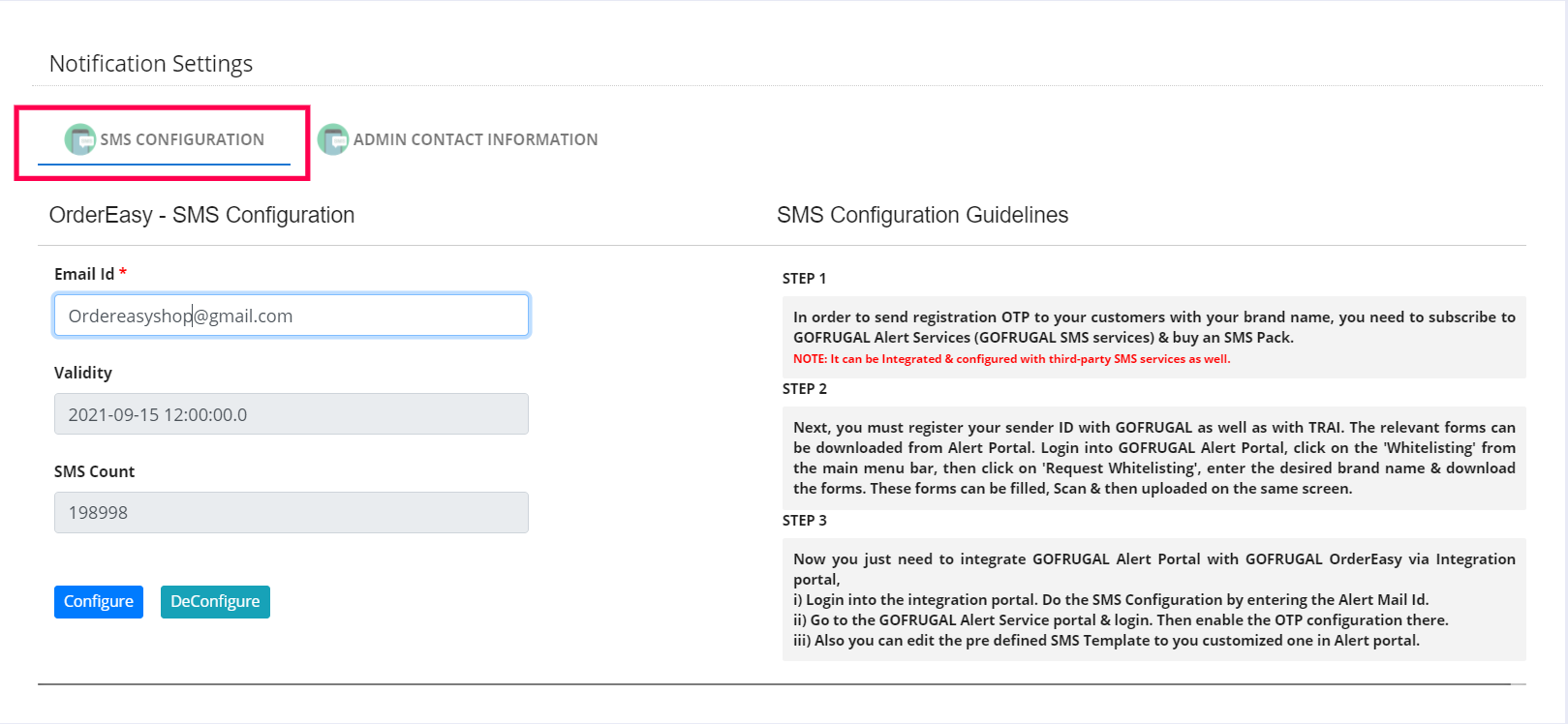 In this tab, you can configure SMS notifications. Enter your 'GOFRUGAL Alert portal user-id' or your 3rd party SMS portal id in the "Email id" text box. The "Validity" & "SMS count" will automatically fetch from the SMS portal & will be shown in their respective text boxes. And then click on the 'Configure' button. If you want to change the SMS portal id, in case it is already configured. Click on the 'DeConfigure' button to undo the current settings & configure the new one again.