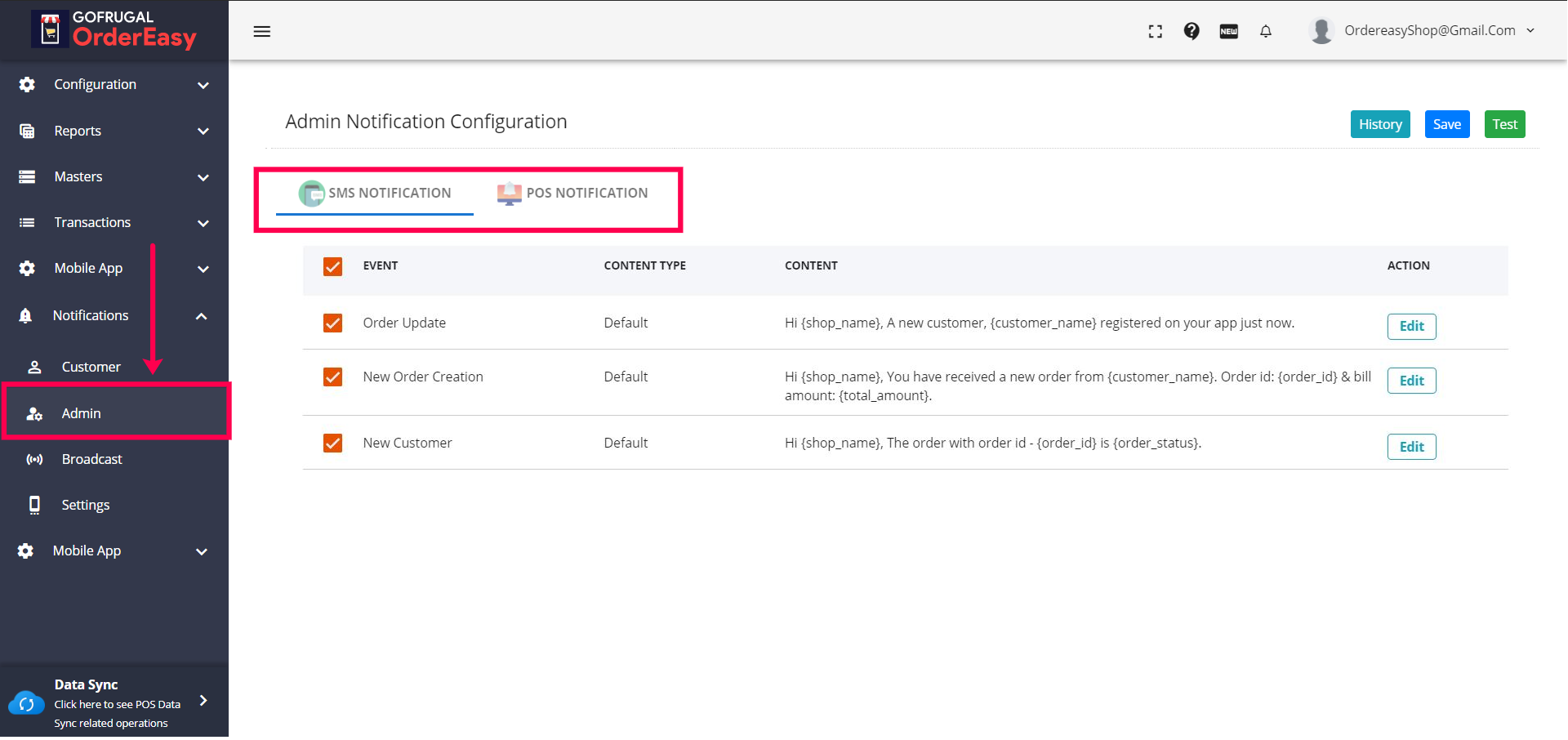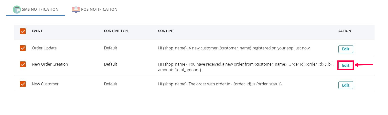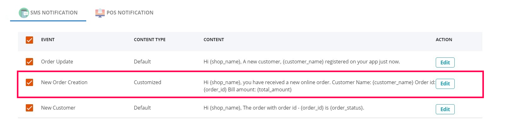 The Mobile Notification tab will view the default push notification templates of all the events & The SMS Notification tab will view the default SMS notification of all the events. Click on the 'Edit' button on the right side if you want to customize the content template of the notification.