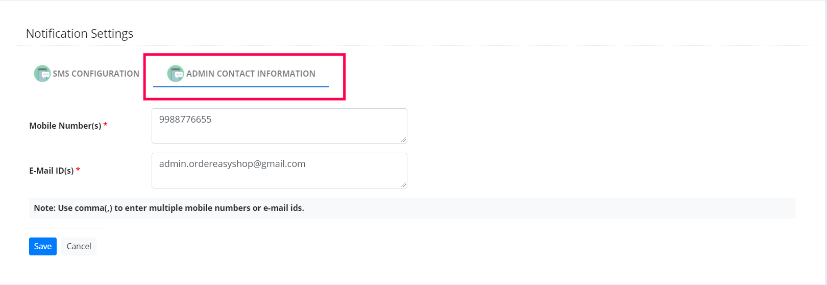 i) Mobile number(s): Enter the mobile number of the admin person to whom the SMS notifications are to be sent. You can also enter multiple contact numbers separating them with a comma.