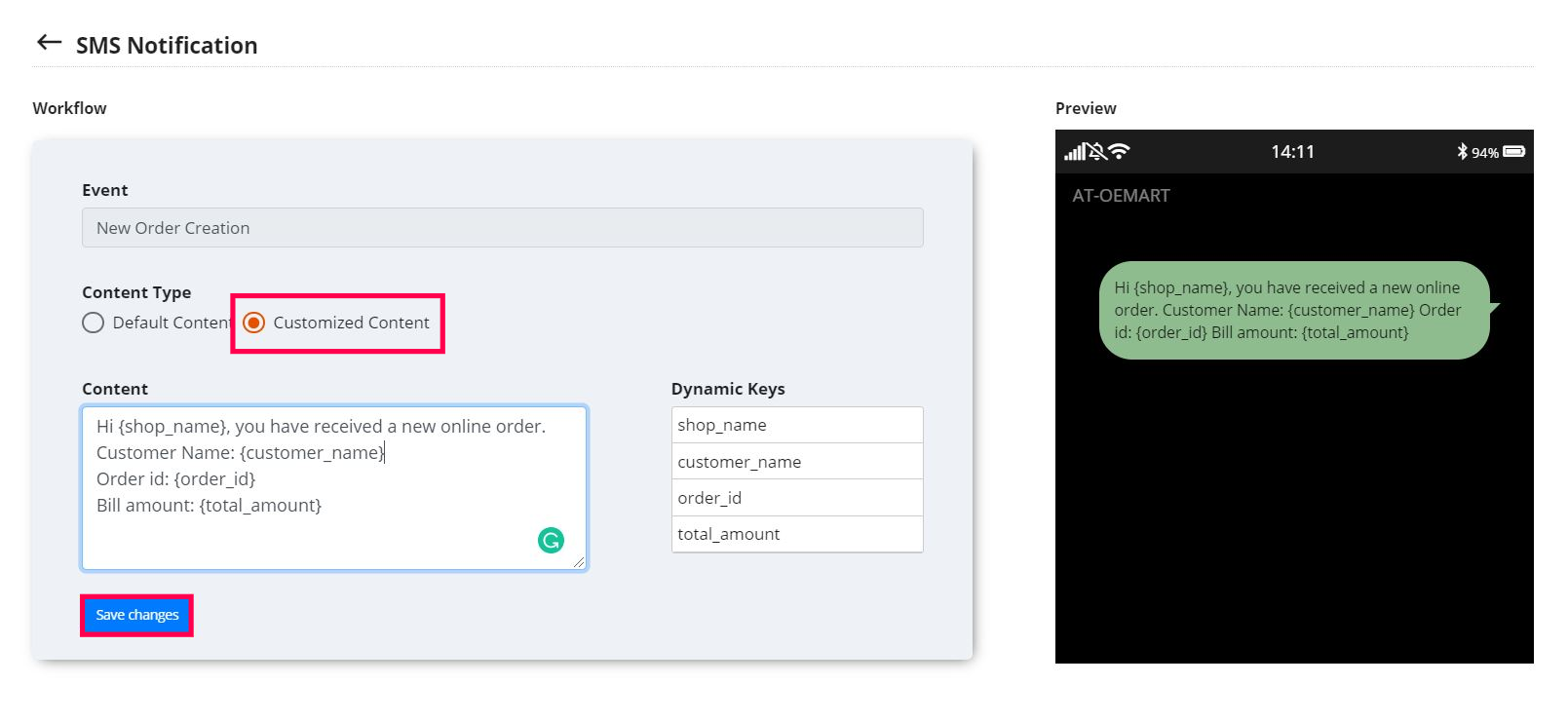 In the appeared window, click on the 'Customized Content' option. It will allow you to type in the customized notification template in the content box below using the 'Dynamic Keys'. Then click on the 'Save Change' button at the bottom. You can see its live preview on the right side of your screen.
