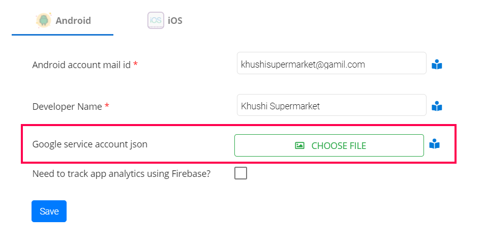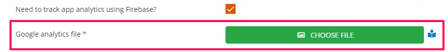 iv) Google analytics file: Only If the above checkbox is checked, this option will be visible. Click on 'Choose File', browse & locate the analytics JSON file from your local drive.