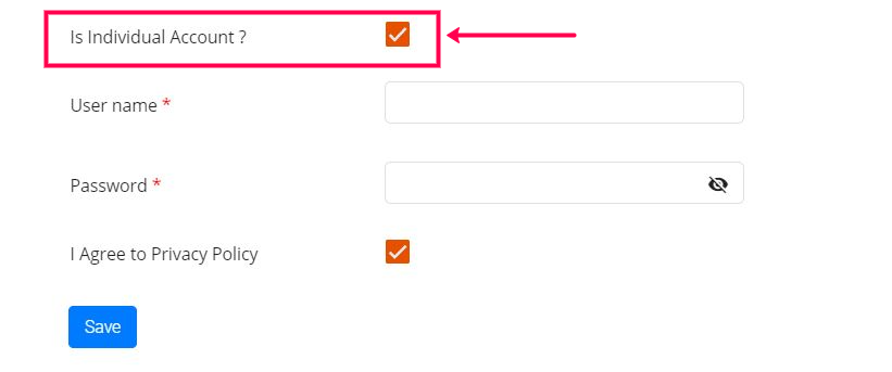 vi) I Agree to Privacy Policy: Only If "Is Individual Account?" checkbox is checked, this will appear on the left side of the screen. Please read the policy & check the 'I agree' checkbox.