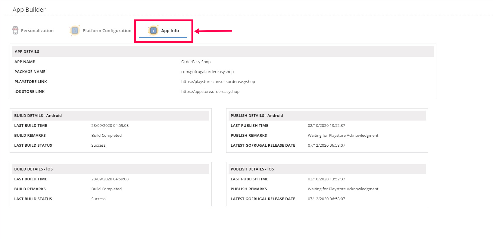 i) APP DETAILS: In this box, you can view the status of your new app build request whether the app is ready & published or not. It's Playstore &/or Appstore link will be displayed.