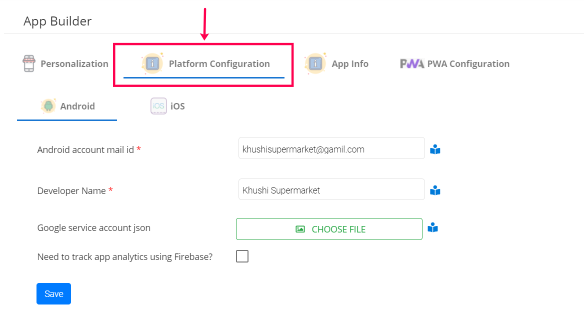 i) Android account mail id: Enter the email id from which the play store console is purchased. (Playstore Account)