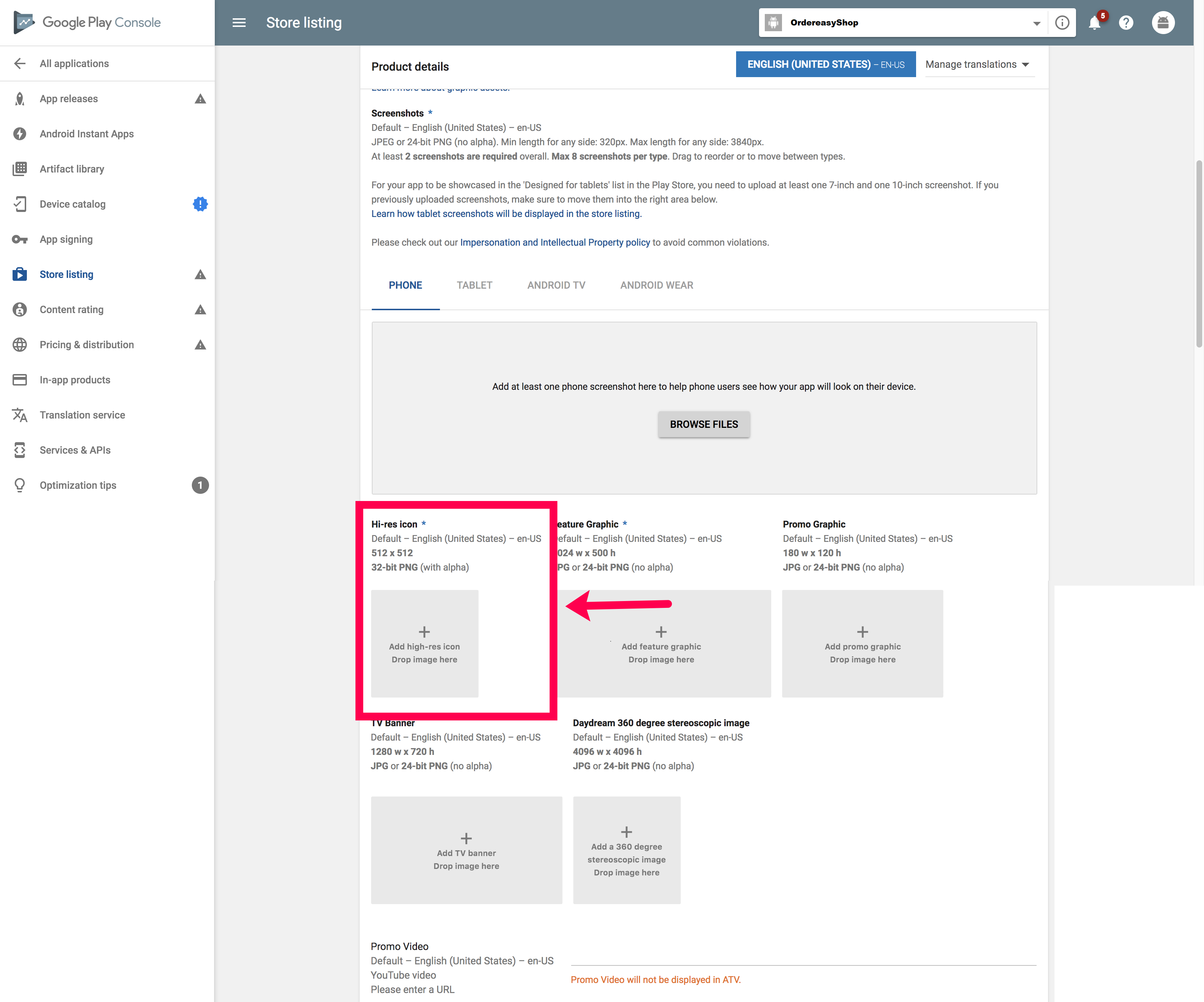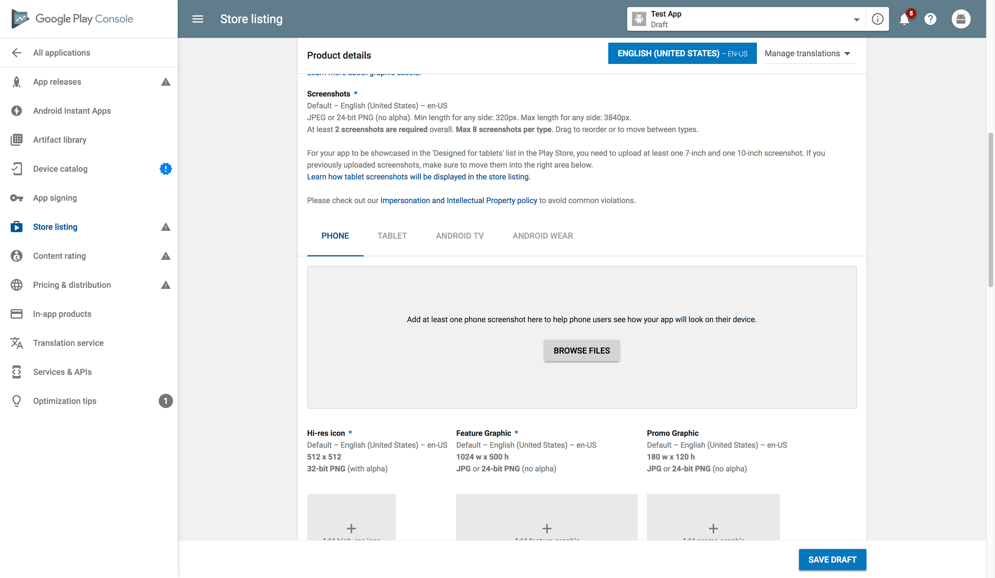 Step 5: Under the 'Screenshots' option, there are different tabs, click on the desired tab to upload its screenshots. e.g.: In the 'Phone' tab click on the 'BROWSE FILES' option to upload the screenshots from your local drive.