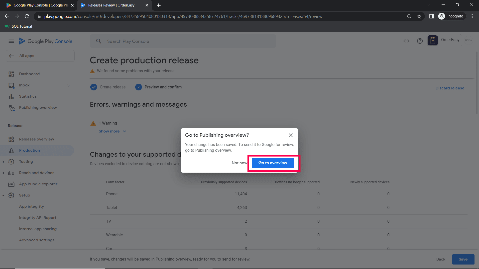 Step 8: In the Go to Publishing Overview pop-up window, click Go to overview.
