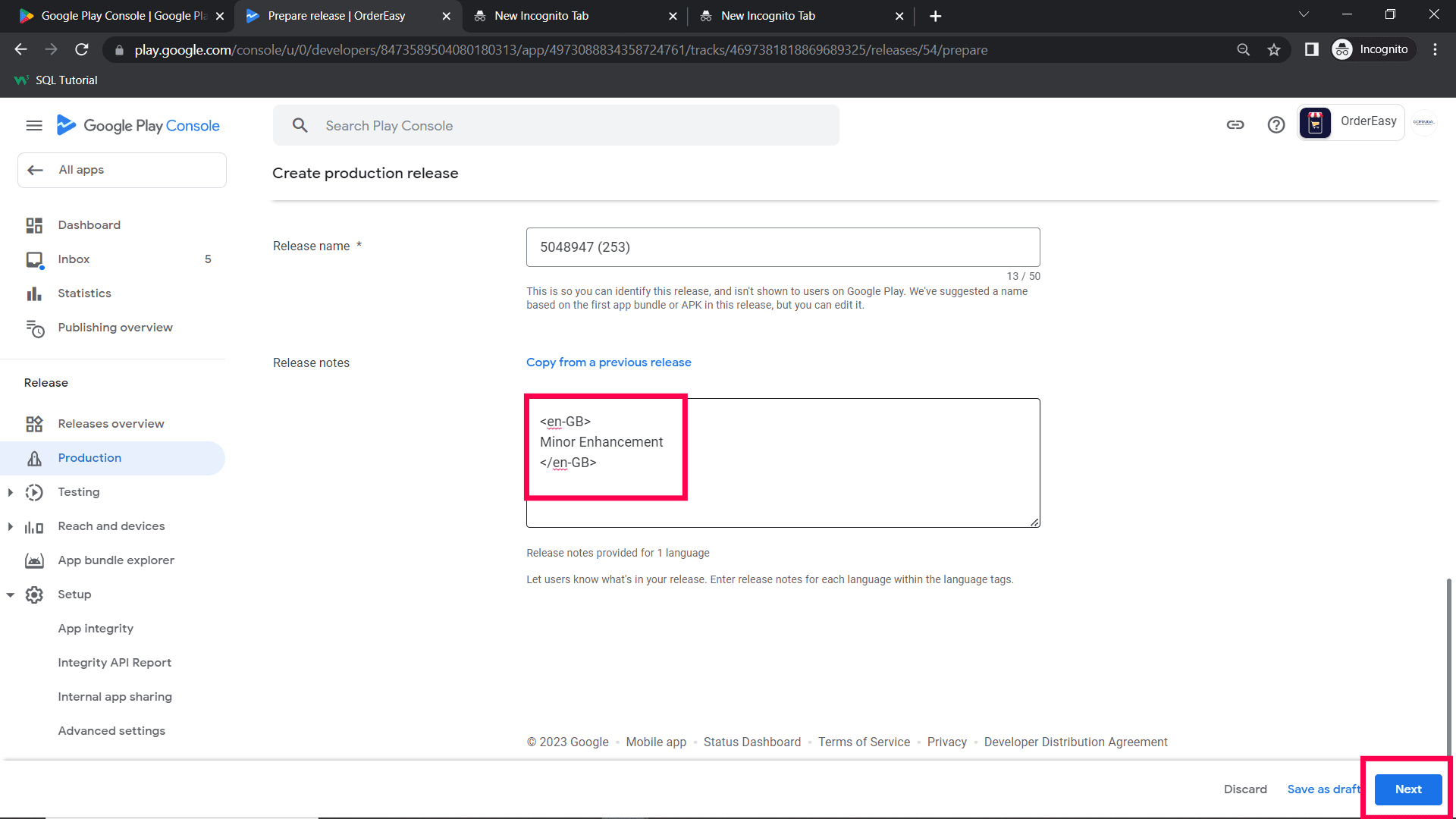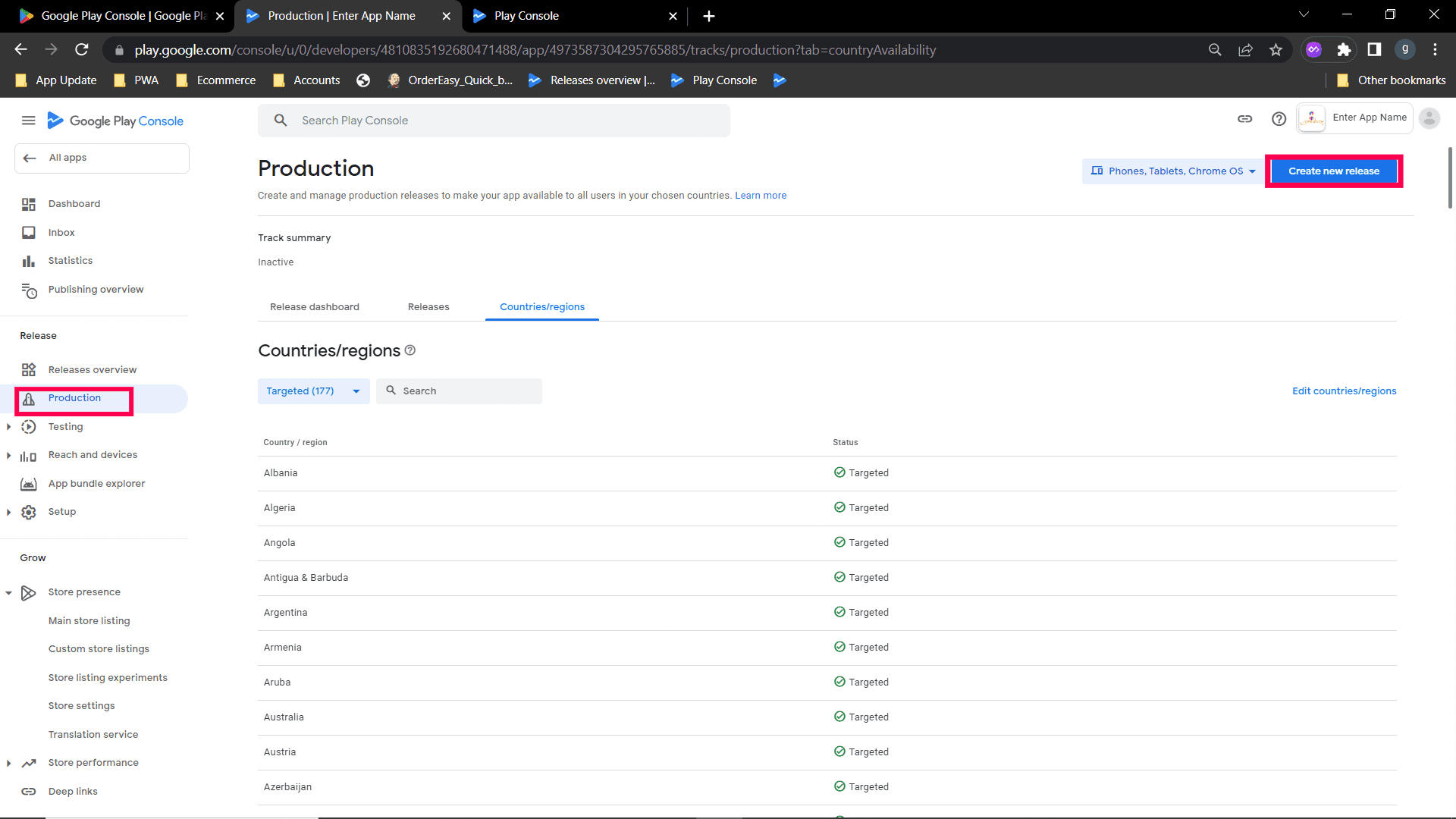 Step 4: Now, go to Production and click Create new release. Now, you will be redirected to release page.