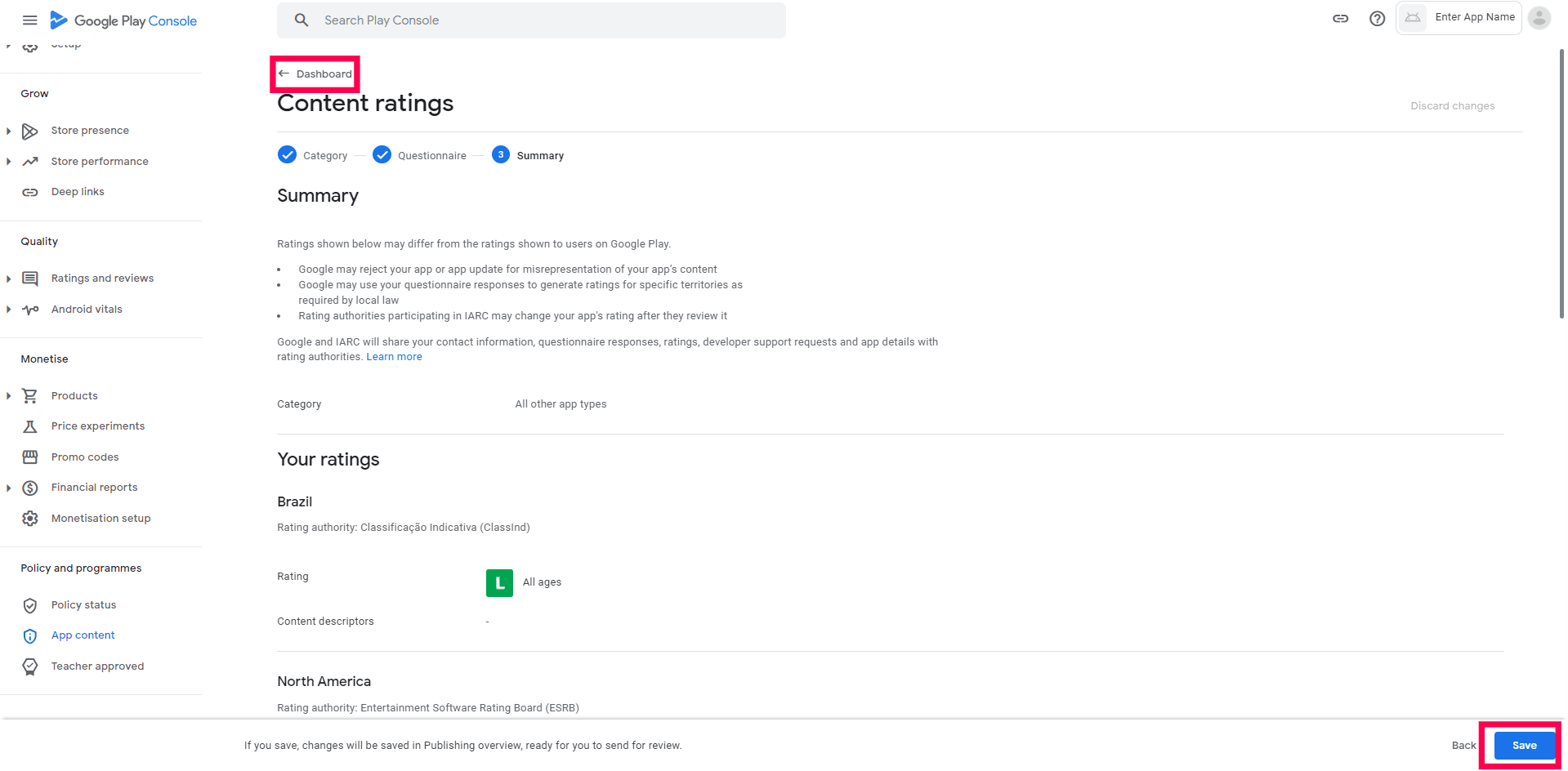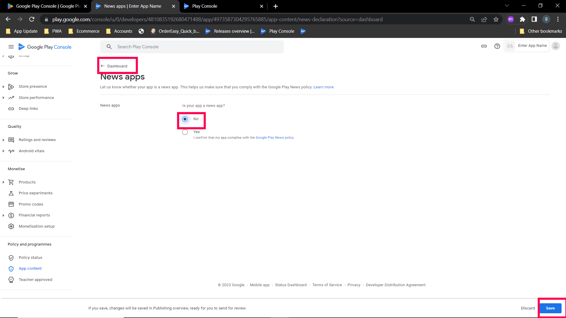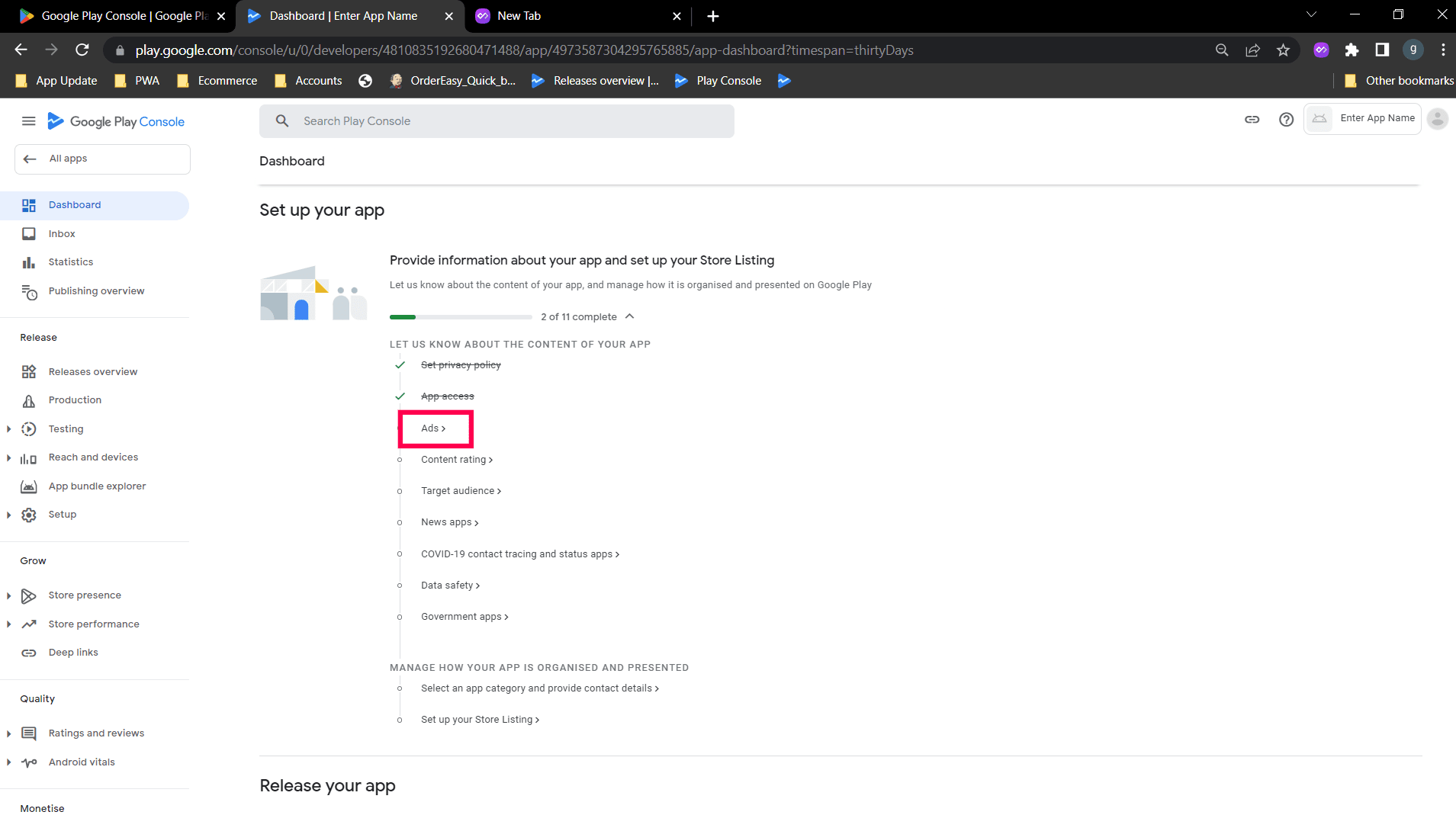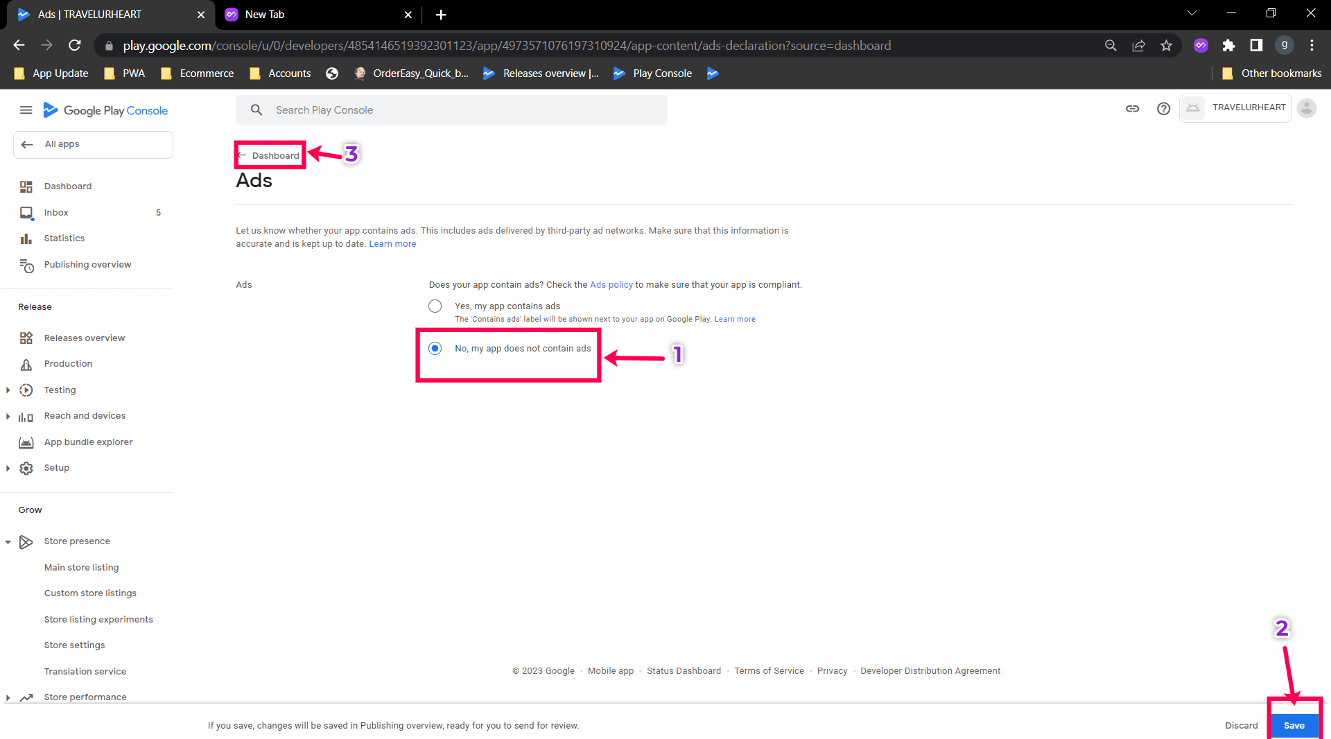 Step 2: Select "No my app does not contain ads option" and save. Go back to the Dashboard