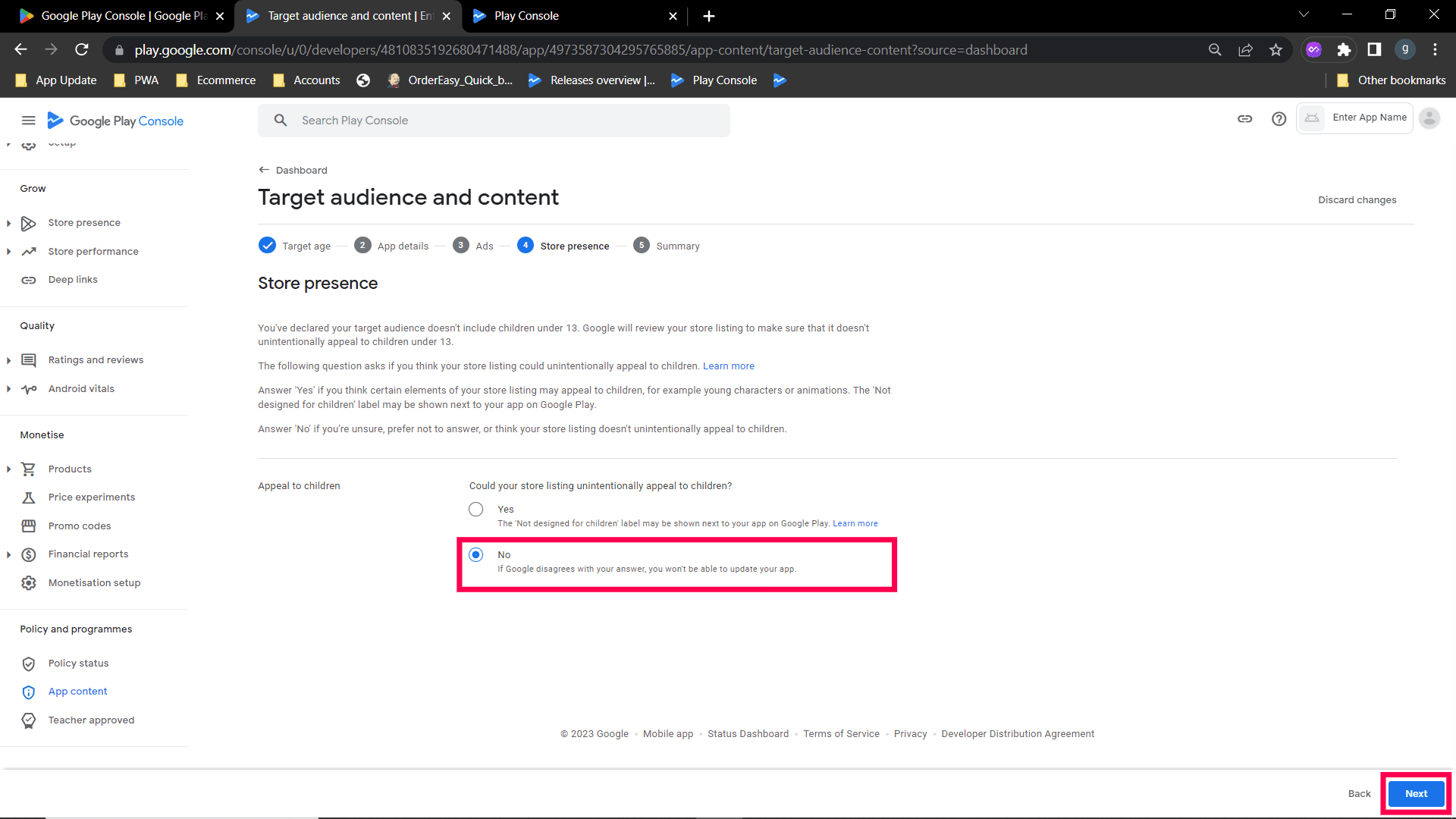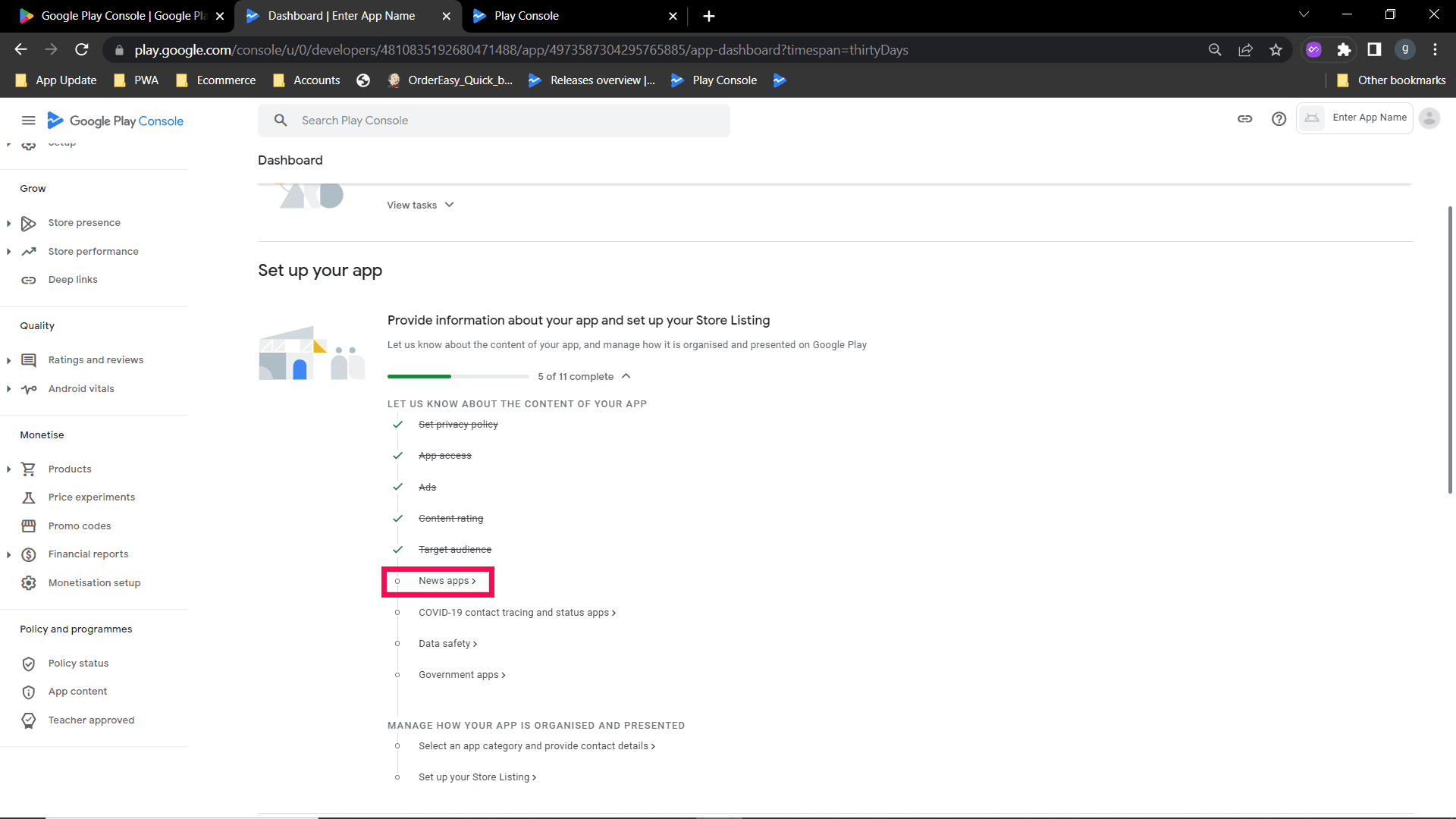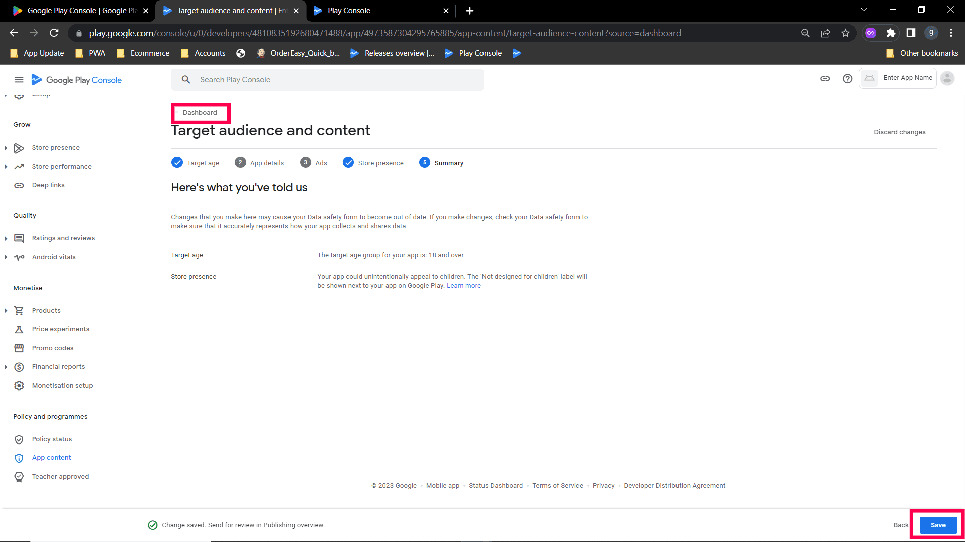 Step 2: Select "No my app does not contain ads option" and save. Go back to the Dashboard