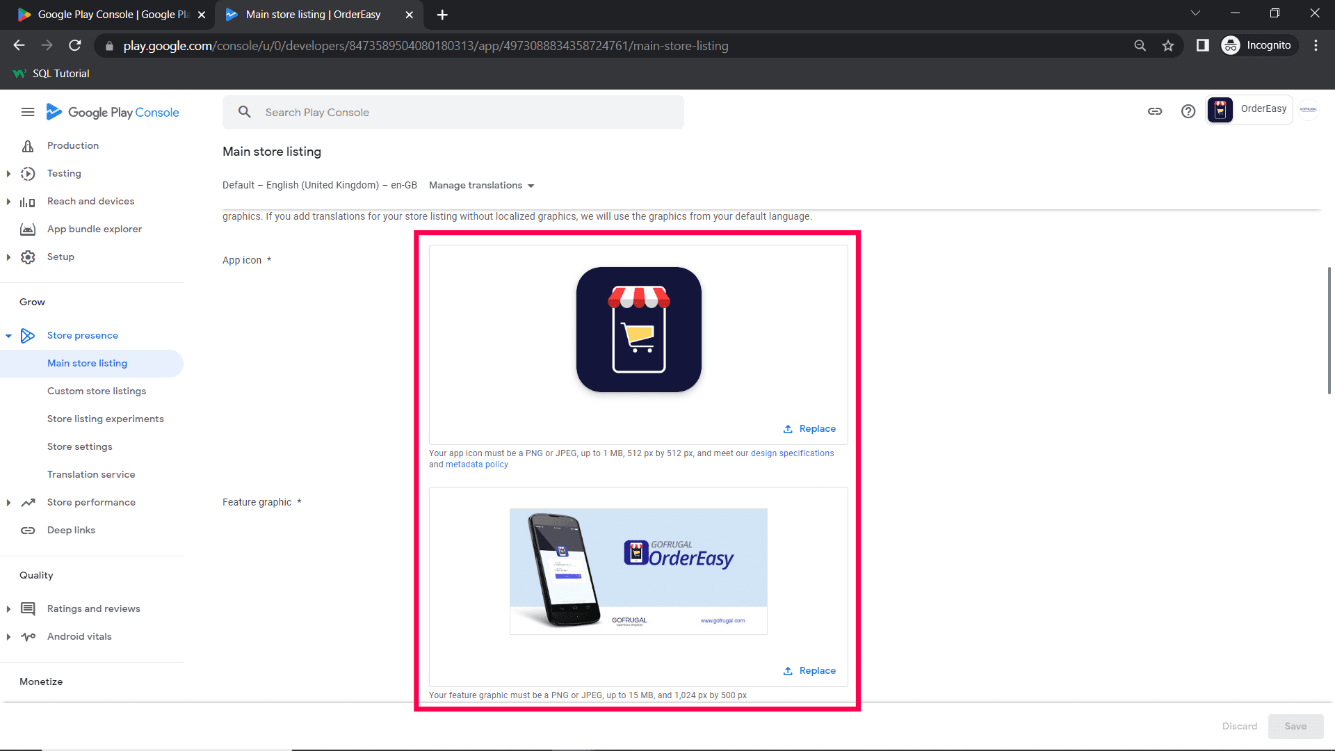 Step 9: Add The App Icon (512 x 512 size ) and feature graphic( 1024 x 500 size) and add the mobile app screenshot to be displayed in the playstore and save